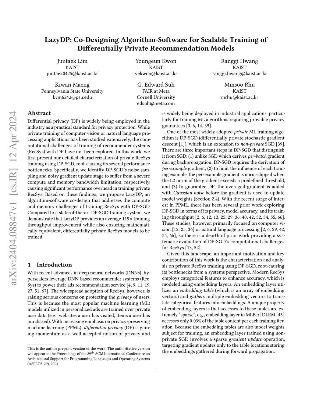 Differential privacy (DP) is widely being employed in the industry as a practical standard for privacy protection. While private training of computer vision or natural language processing applications has been studied extensively, the computational challenges of training of recommender systems (RecSys) with DP have not been explored. In this work, we first present our detailed characterization of private RecSys training using DP-SGD, root-causing its several performance bottlenecks. Specifically, we identify DP-SGD's noise sampling and noisy gradient update stage to suffer from a severe compute and memory bandwidth limitation, respectively, causing significant performance overhead in training private RecSys. Based on these findings, we propose LazyDP, an algorithm-software co-design that addresses the compute and memory challenges of training RecSys with DP-SGD. Compared to a state-of-the-art DP-SGD training system, we demonstrate that LazyDP provides an average 119x training throughput improvement while also ensuring mathematically equivalent, differentially private RecSys models to be trained.