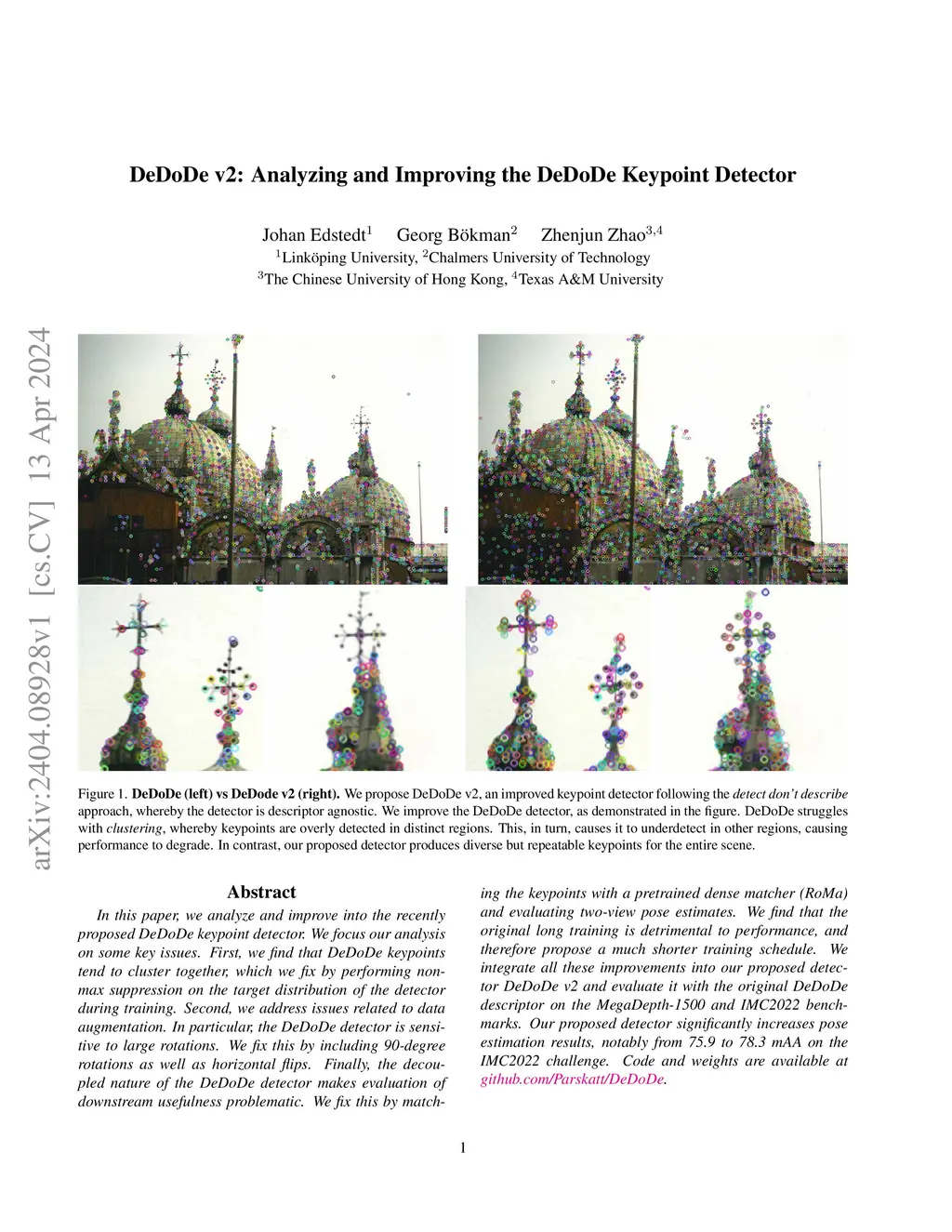 In this paper, we analyze and improve into the recently proposed DeDoDe keypoint detector. We focus our analysis on some key issues. First, we find that DeDoDe keypoints tend to cluster together, which we fix by performing non-max suppression on the target distribution of the detector during training. Second, we address issues related to data augmentation. In particular, the DeDoDe detector is sensitive to large rotations. We fix this by including 90-degree rotations as well as horizontal flips. Finally, the decoupled nature of the DeDoDe detector makes evaluation of downstream usefulness problematic. We fix this by matching the keypoints with a pretrained dense matcher (RoMa) and evaluating two-view pose estimates. We find that the original long training is detrimental to performance, and therefore propose a much shorter training schedule. We integrate all these improvements into our proposed detector DeDoDe v2 and evaluate it with the original DeDoDe descriptor on the MegaDepth-1500 and IMC2022 benchmarks. Our proposed detector significantly increases pose estimation results, notably from 75.9 to 78.3 mAA on the IMC2022 challenge. Code and weights are available at https://github.com/Parskatt/DeDoDe