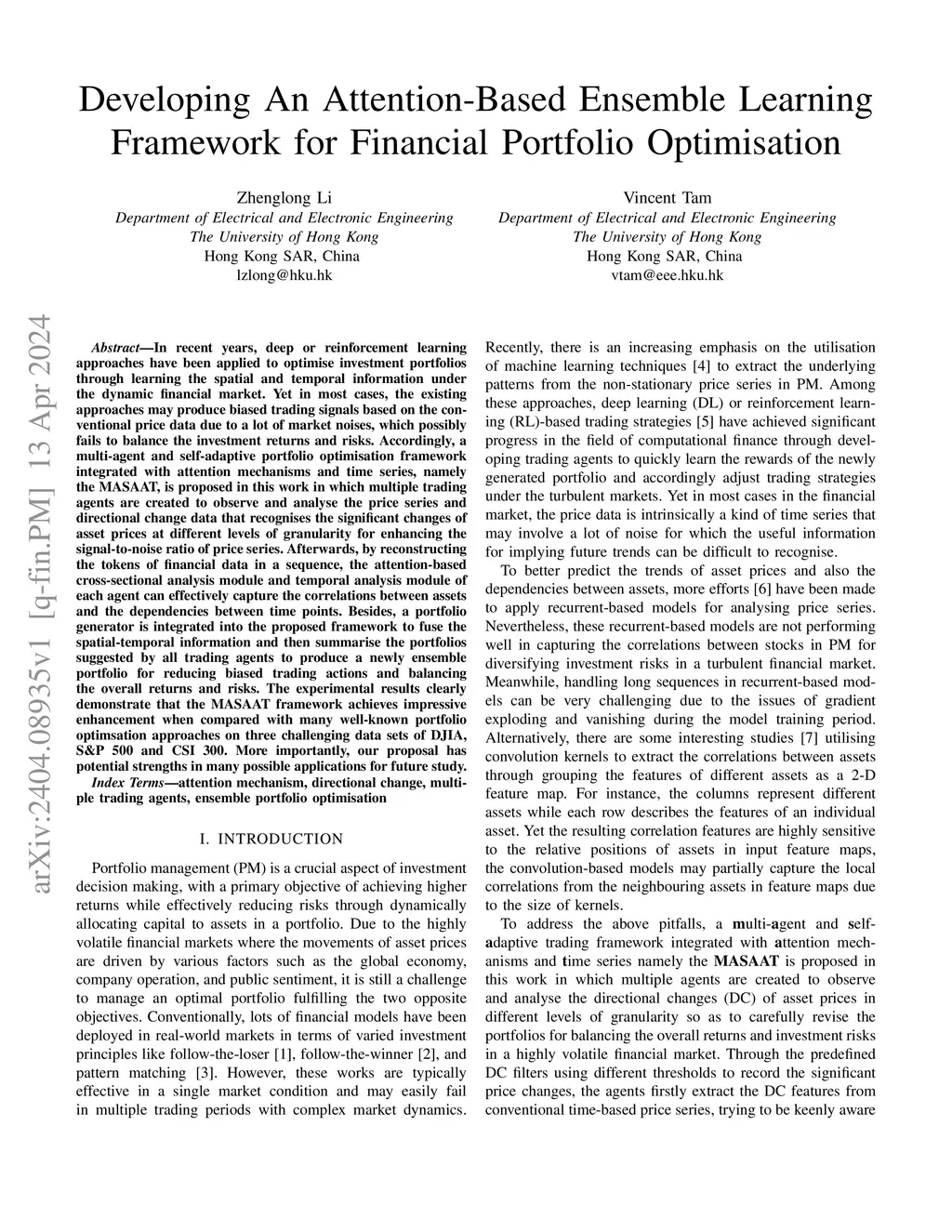 In recent years, deep or reinforcement learning approaches have been applied to optimise investment portfolios through learning the spatial and temporal information under the dynamic financial market. Yet in most cases, the existing approaches may produce biased trading signals based on the conventional price data due to a lot of market noises, which possibly fails to balance the investment returns and risks. Accordingly, a multi-agent and self-adaptive portfolio optimisation framework integrated with attention mechanisms and time series, namely the MASAAT, is proposed in this work in which multiple trading agents are created to observe and analyse the price series and directional change data that recognises the significant changes of asset prices at different levels of granularity for enhancing the signal-to-noise ratio of price series. Afterwards, by reconstructing the tokens of financial data in a sequence, the attention-based cross-sectional analysis module and temporal analysis module of each agent can effectively capture the correlations between assets and the dependencies between time points. Besides, a portfolio generator is integrated into the proposed framework to fuse the spatial-temporal information and then summarise the portfolios suggested by all trading agents to produce a newly ensemble portfolio for reducing biased trading actions and balancing the overall returns and risks. The experimental results clearly demonstrate that the MASAAT framework achieves impressive enhancement when compared with many well-known portfolio optimsation approaches on three challenging data sets of DJIA, S&P 500 and CSI 300. More importantly, our proposal has potential strengths in many possible applications for future study.