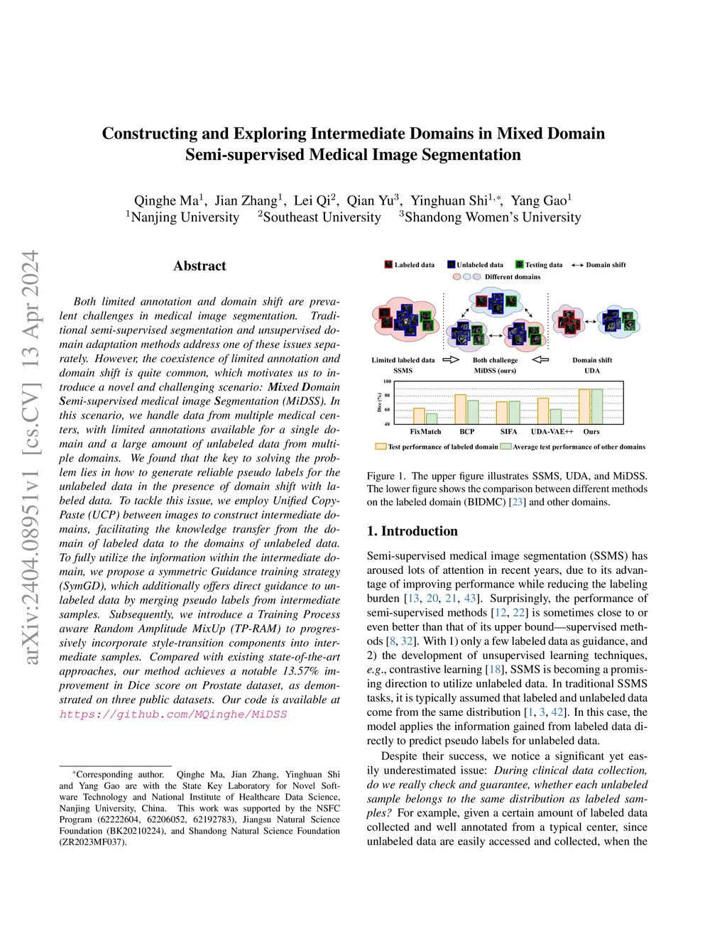 Both limited annotation and domain shift are prevalent challenges in medical image segmentation. Traditional semi-supervised segmentation and unsupervised domain adaptation methods address one of these issues separately. However, the coexistence of limited annotation and domain shift is quite common, which motivates us to introduce a novel and challenging scenario: Mixed Domain Semi-supervised medical image Segmentation (MiDSS). In this scenario, we handle data from multiple medical centers, with limited annotations available for a single domain and a large amount of unlabeled data from multiple domains. We found that the key to solving the problem lies in how to generate reliable pseudo labels for the unlabeled data in the presence of domain shift with labeled data. To tackle this issue, we employ Unified Copy-Paste (UCP) between images to construct intermediate domains, facilitating the knowledge transfer from the domain of labeled data to the domains of unlabeled data. To fully utilize the information within the intermediate domain, we propose a symmetric Guidance training strategy (SymGD), which additionally offers direct guidance to unlabeled data by merging pseudo labels from intermediate samples. Subsequently, we introduce a Training Process aware Random Amplitude MixUp (TP-RAM) to progressively incorporate style-transition components into intermediate samples. Compared with existing state-of-the-art approaches, our method achieves a notable 13.57% improvement in Dice score on Prostate dataset, as demonstrated on three public datasets. Our code is available at https://github.com/MQinghe/MiDSS .