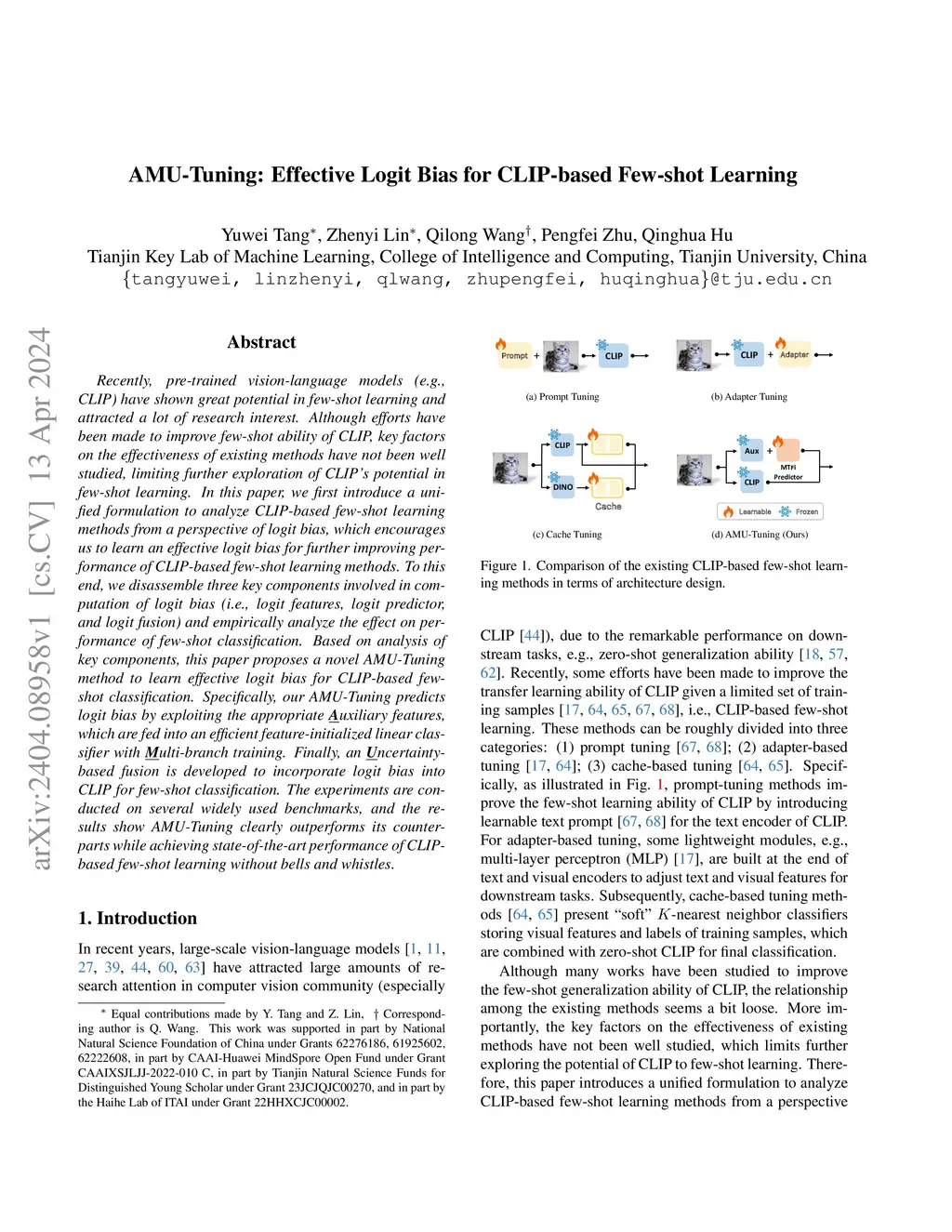 Recently, pre-trained vision-language models (e.g., CLIP) have shown great potential in few-shot learning and attracted a lot of research interest. Although efforts have been made to improve few-shot ability of CLIP, key factors on the effectiveness of existing methods have not been well studied, limiting further exploration of CLIP's potential in few-shot learning. In this paper, we first introduce a unified formulation to analyze CLIP-based few-shot learning methods from a perspective of logit bias, which encourages us to learn an effective logit bias for further improving performance of CLIP-based few-shot learning methods. To this end, we disassemble three key components involved in computation of logit bias (i.e., logit features, logit predictor, and logit fusion) and empirically analyze the effect on performance of few-shot classification. Based on analysis of key components, this paper proposes a novel AMU-Tuning method to learn effective logit bias for CLIP-based few-shot classification. Specifically, our AMU-Tuning predicts logit bias by exploiting the appropriate uxiliary features, which are fed into an efficient feature-initialized linear classifier with ulti-branch training. Finally, an ncertainty-based fusion is developed to incorporate logit bias into CLIP for few-shot classification. The experiments are conducted on several widely used benchmarks, and the results show AMU-Tuning clearly outperforms its counterparts while achieving state-of-the-art performance of CLIP-based few-shot learning without bells and whistles.