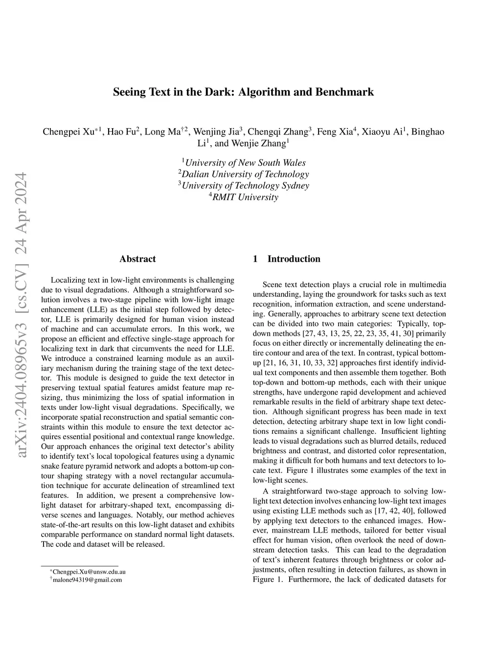 Localizing text in low-light environments is challenging due to visual degradations. Although a straightforward solution involves a two-stage pipeline with low-light image enhancement (LLE) as the initial step followed by detector, LLE is primarily designed for human vision instead of machine and can accumulate errors. In this work, we propose an efficient and effective single-stage approach for localizing text in dark that circumvents the need for LLE. We introduce a constrained learning module as an auxiliary mechanism during the training stage of the text detector. This module is designed to guide the text detector in preserving textual spatial features amidst feature map resizing, thus minimizing the loss of spatial information in texts under low-light visual degradations. Specifically, we incorporate spatial reconstruction and spatial semantic constraints within this module to ensure the text detector acquires essential positional and contextual range knowledge. Our approach enhances the original text detector's ability to identify text's local topological features using a dynamic snake feature pyramid network and adopts a bottom-up contour shaping strategy with a novel rectangular accumulation technique for accurate delineation of streamlined text features. In addition, we present a comprehensive low-light dataset for arbitrary-shaped text, encompassing diverse scenes and languages. Notably, our method achieves state-of-the-art results on this low-light dataset and exhibits comparable performance on standard normal light datasets. The code and dataset will be released.