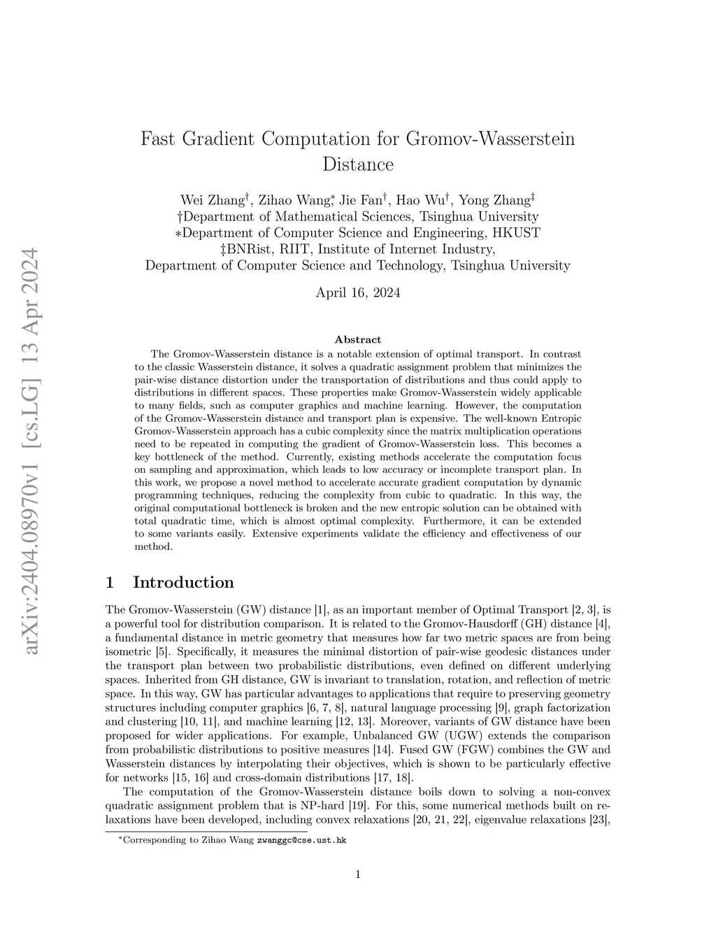 The Gromov-Wasserstein distance is a notable extension of optimal transport. In contrast to the classic Wasserstein distance, it solves a quadratic assignment problem that minimizes the pair-wise distance distortion under the transportation of distributions and thus could apply to distributions in different spaces. These properties make Gromov-Wasserstein widely applicable to many fields, such as computer graphics and machine learning. However, the computation of the Gromov-Wasserstein distance and transport plan is expensive. The well-known Entropic Gromov-Wasserstein approach has a cubic complexity since the matrix multiplication operations need to be repeated in computing the gradient of Gromov-Wasserstein loss. This becomes a key bottleneck of the method. Currently, existing methods accelerate the computation focus on sampling and approximation, which leads to low accuracy or incomplete transport plan. In this work, we propose a novel method to accelerate accurate gradient computation by dynamic programming techniques, reducing the complexity from cubic to quadratic. In this way, the original computational bottleneck is broken and the new entropic solution can be obtained with total quadratic time, which is almost optimal complexity. Furthermore, it can be extended to some variants easily. Extensive experiments validate the efficiency and effectiveness of our method.