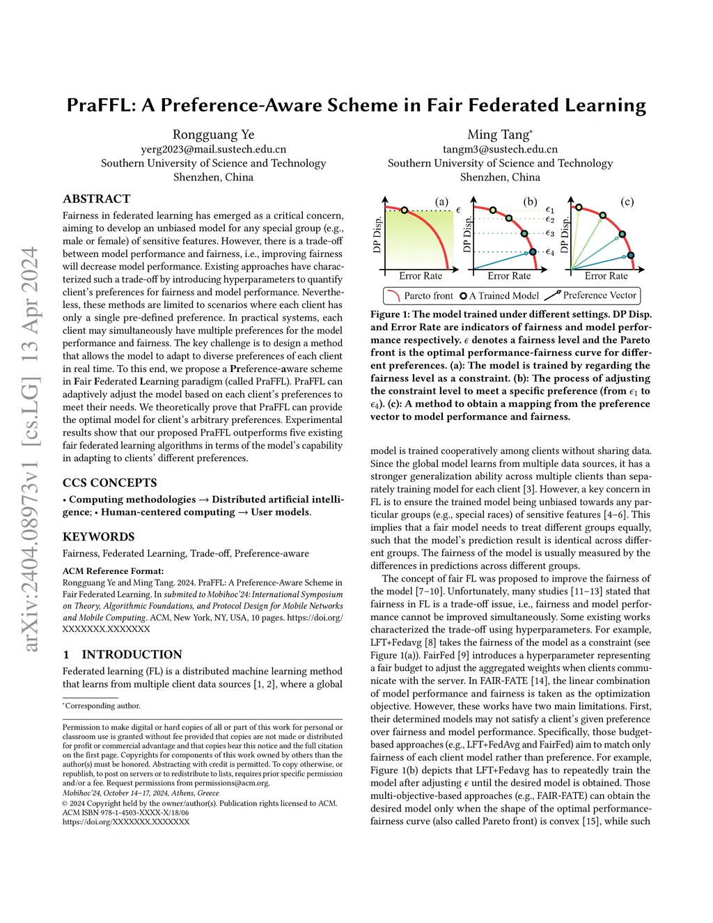 Fairness in federated learning has emerged as a critical concern, aiming to develop an unbiased model among groups (e.g., male or female) of diverse sensitive features. However, there is a trade-off between model performance and fairness, i.e., improving model fairness will decrease model performance. Existing approaches have characterized such a trade-off by introducing hyperparameters to quantify client's preferences for model fairness and model performance. Nevertheless, these approaches are limited to scenarios where each client has only a single pre-defined preference, and fail to work in practical systems where each client generally has multiple preferences. To this end, we propose a Preference-aware scheme in Fair Federated Learning (called PraFFL) to generate preference-specific models in real time. PraFFL can adaptively adjust the model based on each client's preferences to meet their needs. We theoretically prove that PraFFL can offer the optimal model tailored to an arbitrary preference of each client, and show its linear convergence. Experimental results show that our proposed PraFFL outperforms six fair federated learning algorithms in terms of the model's capability of adapting to clients' different preferences. Our implementation is available atthis https URL.