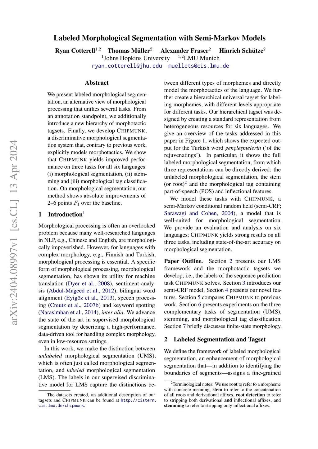 We present labeled morphological segmentation, an alternative view of morphological processing that unifies several tasks. From an annotation standpoint, we additionally introduce a new hierarchy of morphotactic tagsets. Finally, we develop \modelname, a discriminative morphological segmentation system that, contrary to previous work, explicitly models morphotactics. We show that \textsc{chipmunk} yields improved performance on three tasks for all six languages: (i) morphological segmentation, (ii) stemming and (iii) morphological tag classification. On morphological segmentation, our method shows absolute improvements of 2--6 points over the baseline.
