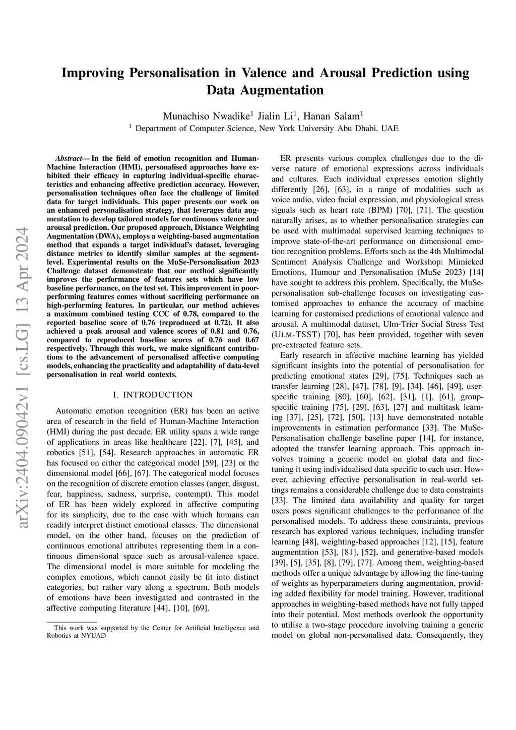 In the field of emotion recognition and Human-Machine Interaction (HMI), personalised approaches have exhibited their efficacy in capturing individual-specific characteristics and enhancing affective prediction accuracy. However, personalisation techniques often face the challenge of limited data for target individuals. This paper presents our work on an enhanced personalisation strategy, that leverages data augmentation to develop tailored models for continuous valence and arousal prediction. Our proposed approach, Distance Weighting Augmentation (DWA), employs a weighting-based augmentation method that expands a target individual's dataset, leveraging distance metrics to identify similar samples at the segment-level. Experimental results on the MuSe-Personalisation 2023 Challenge dataset demonstrate that our method significantly improves the performance of features sets which have low baseline performance, on the test set. This improvement in poor-performing features comes without sacrificing performance on high-performing features. In particular, our method achieves a maximum combined testing CCC of 0.78, compared to the reported baseline score of 0.76 (reproduced at 0.72). It also achieved a peak arousal and valence scores of 0.81 and 0.76, compared to reproduced baseline scores of 0.76 and 0.67 respectively. Through this work, we make significant contributions to the advancement of personalised affective computing models, enhancing the practicality and adaptability of data-level personalisation in real world contexts.