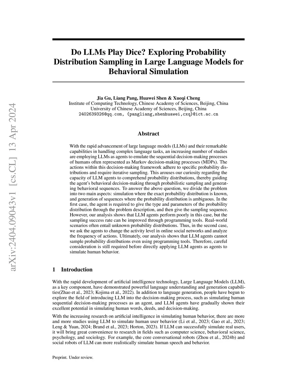 With the rapid advancement of large language models (LLMs) for handling complex language tasks, an increasing number of studies are employing LLMs as agents to emulate the sequential decision-making processes of humans often represented as Markov decision-making processes (MDPs). The actions in MDPs adhere to specific probability distributions and require iterative sampling. This arouses curiosity regarding the capacity of LLM agents to comprehend probability distributions, thereby guiding the agent's behavioral decision-making through probabilistic sampling and generating behavioral sequences. To answer the above question, we divide the problem into two main aspects: sequence simulation with known probability distribution and sequence simulation with unknown probability distribution. Our analysis indicates that LLM agents can understand probabilities, but they struggle with probability sampling. Their ability to perform probabilistic sampling can be improved to some extent by integrating coding tools, but this level of sampling precision still makes it difficult to simulate human behavior as agents.