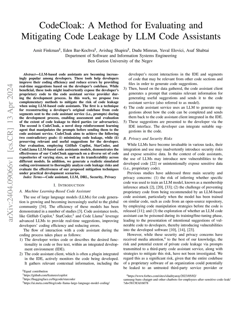 LLM-based code assistants are becoming increasingly popular among developers. These tools help developers improve their coding efficiency and reduce errors by providing real-time suggestions based on the developer's codebase. While beneficial, these tools might inadvertently expose the developer's proprietary code to the code assistant service provider during the development process. In this work, we propose two complementary methods to mitigate the risk of code leakage when using LLM-based code assistants. The first is a technique for reconstructing a developer's original codebase from code segments sent to the code assistant service (i.e., prompts) during the development process, enabling assessment and evaluation of the extent of code leakage to third parties (or adversaries). The second is CodeCloak, a novel deep reinforcement learning agent that manipulates the prompts before sending them to the code assistant service. CodeCloak aims to achieve the following two contradictory goals: (i) minimizing code leakage, while (ii) preserving relevant and useful suggestions for the developer. Our evaluation, employing GitHub Copilot, StarCoder, and CodeLlama LLM-based code assistants models, demonstrates the effectiveness of our CodeCloak approach on a diverse set of code repositories of varying sizes, as well as its transferability across different models. In addition, we generate a realistic simulated coding environment to thoroughly analyze code leakage risks and evaluate the effectiveness of our proposed mitigation techniques under practical development scenarios.