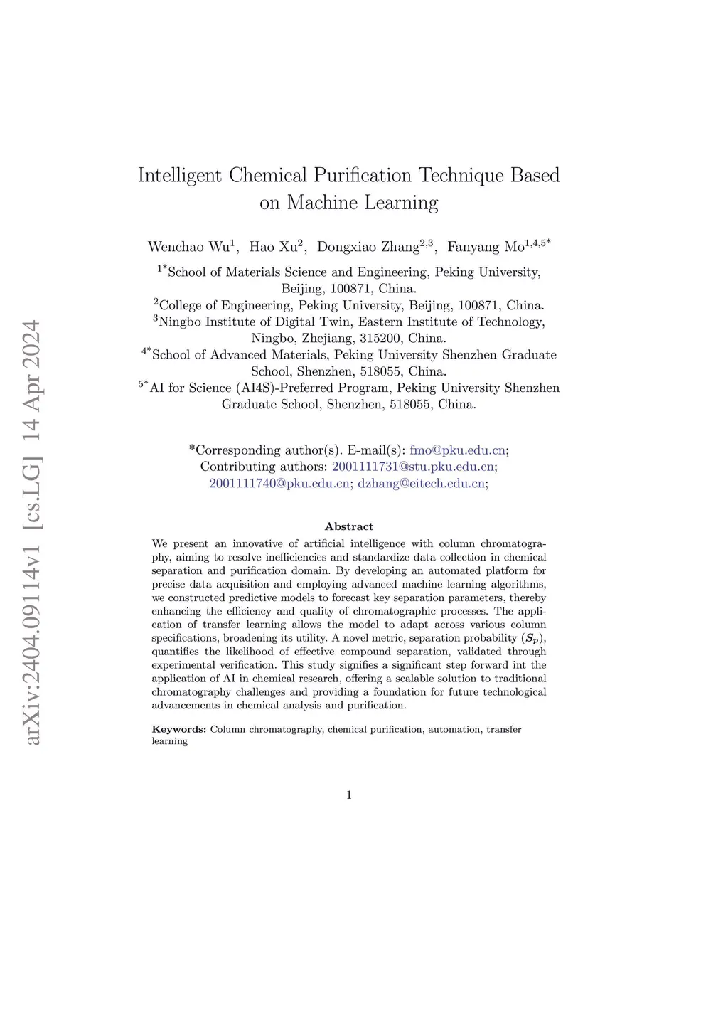 We present an innovative of artificial intelligence with column chromatography, aiming to resolve inefficiencies and standardize data collection in chemical separation and purification domain. By developing an automated platform for precise data acquisition and employing advanced machine learning algorithms, we constructed predictive models to forecast key separation parameters, thereby enhancing the efficiency and quality of chromatographic processes. The application of transfer learning allows the model to adapt across various column specifications, broadening its utility. A novel metric, separation probability (), quantifies the likelihood of effective compound separation, validated through experimental verification. This study signifies a significant step forward int the application of AI in chemical research, offering a scalable solution to traditional chromatography challenges and providing a foundation for future technological advancements in chemical analysis and purification.