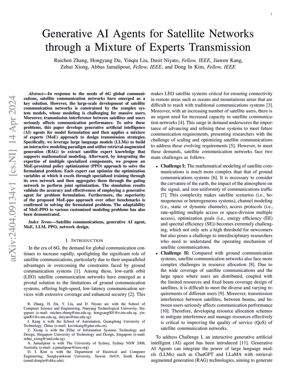 In response to the needs of 6G global communications, satellite communication networks have emerged as a key solution. However, the large-scale development of satellite communication networks is constrained by the complex system models, whose modeling is challenging for massive users. Moreover, transmission interference between satellites and users seriously affects communication performance. To solve these problems, this paper develops generative artificial intelligence (AI) agents for model formulation and then applies a mixture of experts (MoE) approach to design transmission strategies. Specifically, we leverage large language models (LLMs) to build an interactive modeling paradigm and utilize retrieval-augmented generation (RAG) to extract satellite expert knowledge that supports mathematical modeling. Afterward, by integrating the expertise of multiple specialized components, we propose an MoE-proximal policy optimization (PPO) approach to solve the formulated problem. Each expert can optimize the optimization variables at which it excels through specialized training through its own network and then aggregates them through the gating network to perform joint optimization. The simulation results validate the accuracy and effectiveness of employing a generative agent for problem formulation. Furthermore, the superiority of the proposed MoE-ppo approach over other benchmarks is confirmed in solving the formulated problem. The adaptability of MoE-PPO to various customized modeling problems has also been demonstrated.