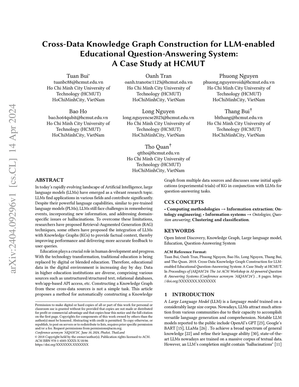 In today's rapidly evolving landscape of Artificial Intelligence, large language models (LLMs) have emerged as a vibrant research topic. LLMs find applications in various fields and contribute significantly. Despite their powerful language capabilities, similar to pre-trained language models (PLMs), LLMs still face challenges in remembering events, incorporating new information, and addressing domain-specific issues or hallucinations. To overcome these limitations, researchers have proposed Retrieval-Augmented Generation (RAG) techniques, some others have proposed the integration of LLMs with Knowledge Graphs (KGs) to provide factual context, thereby improving performance and delivering more accurate feedback to user queries. Education plays a crucial role in human development and progress. With the technology transformation, traditional education is being replaced by digital or blended education. Therefore, educational data in the digital environment is increasing day by day. Data in higher education institutions are diverse, comprising various sources such as unstructured/structured text, relational databases, web/app-based API access, etc. Constructing a Knowledge Graph from these cross-data sources is not a simple task. This article proposes a method for automatically constructing a Knowledge Graph from multiple data sources and discusses some initial applications (experimental trials) of KG in conjunction with LLMs for question-answering tasks.