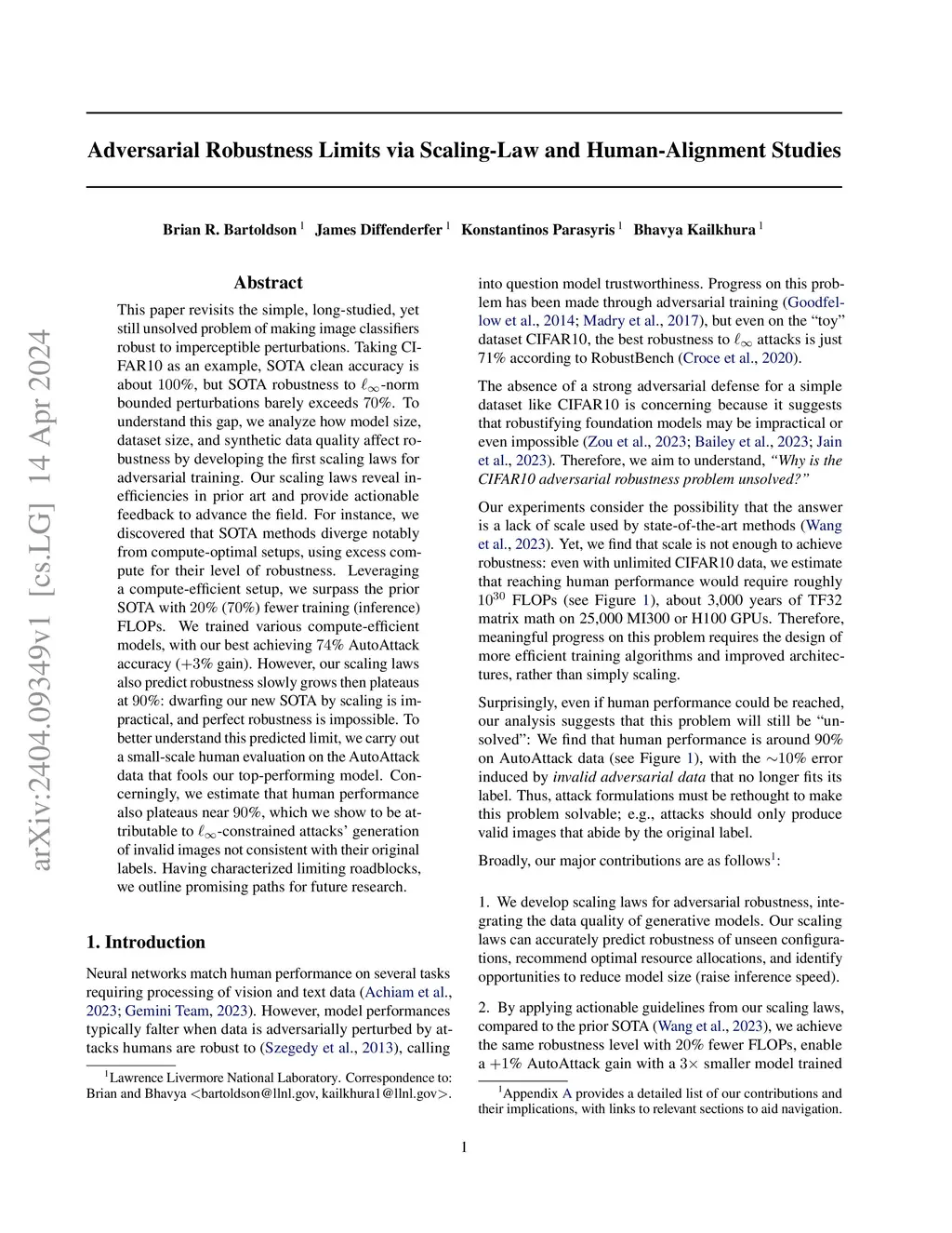 This paper revisits the simple, long-studied, yet still unsolved problem of making image classifiers robust to imperceptible perturbations. Taking CIFAR10 as an example, SOTA clean accuracy is about %, but SOTA robustness to -norm bounded perturbations barely exceeds %. To understand this gap, we analyze how model size, dataset size, and synthetic data quality affect robustness by developing the first scaling laws for adversarial training. Our scaling laws reveal inefficiencies in prior art and provide actionable feedback to advance the field. For instance, we discovered that SOTA methods diverge notably from compute-optimal setups, using excess compute for their level of robustness. Leveraging a compute-efficient setup, we surpass the prior SOTA with % (%) fewer training (inference) FLOPs. We trained various compute-efficient models, with our best achieving % AutoAttack accuracy (% gain). However, our scaling laws also predict robustness slowly grows then plateaus at %: dwarfing our new SOTA by scaling is impractical, and perfect robustness is impossible. To better understand this predicted limit, we carry out a small-scale human evaluation on the AutoAttack data that fools our top-performing model. Concerningly, we estimate that human performance also plateaus near %, which we show to be attributable to -constrained attacks' generation of invalid images not consistent with their original labels. Having characterized limiting roadblocks, we outline promising paths for future research.