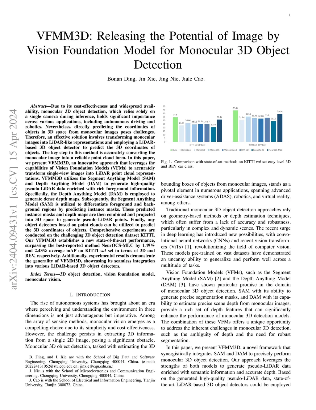 Due to its cost-effectiveness and widespread availability, monocular 3D object detection, which relies solely on a single camera during inference, holds significant importance across various applications, including autonomous driving and robotics. Nevertheless, directly predicting the coordinates of objects in 3D space from monocular images poses challenges. Therefore, an effective solution involves transforming monocular images into LiDAR-like representations and employing a LiDAR-based 3D object detector to predict the 3D coordinates of objects. The key step in this method is accurately converting the monocular image into a reliable point cloud form. In this paper, we present VFMM3D, an innovative approach that leverages the capabilities of Vision Foundation Models (VFMs) to accurately transform single-view images into LiDAR point cloud representations. VFMM3D utilizes the Segment Anything Model (SAM) and Depth Anything Model (DAM) to generate high-quality pseudo-LiDAR data enriched with rich foreground information. Specifically, the Depth Anything Model (DAM) is employed to generate dense depth maps. Subsequently, the Segment Anything Model (SAM) is utilized to differentiate foreground and background regions by predicting instance masks. These predicted instance masks and depth maps are then combined and projected into 3D space to generate pseudo-LiDAR points. Finally, any object detectors based on point clouds can be utilized to predict the 3D coordinates of objects. Comprehensive experiments are conducted on the challenging 3D object detection dataset KITTI. Our VFMM3D establishes a new state-of-the-art performance. Additionally, experimental results demonstrate the generality of VFMM3D, showcasing its seamless integration into various LiDAR-based 3D object detectors.