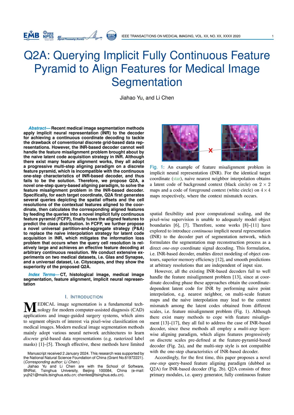 Recent medical image segmentation methods apply implicit neural representation (INR) to the decoder for achieving a continuous coordinate decoding to tackle the drawback of conventional discrete grid-based data representations. However, the INR-based decoder cannot well handle the feature misalignment problem brought about by the naive latent code acquisition strategy in INR. Although there exist many feature alignment works, they all adopt a progressive multi-step aligning paradigm on a discrete feature pyramid, which is incompatible with the continuous one-step characteristics of INR-based decoder, and thus fails to be the solution. Therefore, we propose Q2A, a novel one-step query-based aligning paradigm, to solve the feature misalignment problem in the INR-based decoder. Specifically, for each target coordinate, Q2A first generates several queries depicting the spatial offsets and the cell resolutions of the contextual features aligned to the coordinate, then calculates the corresponding aligned features by feeding the queries into a novel implicit fully continuous feature pyramid (FCFP), finally fuses the aligned features to predict the class distribution. In FCFP, we further propose a novel universal partition-and-aggregate strategy (P&A) to replace the naive interpolation strategy for latent code acquisition in INR, which mitigates the information loss problem that occurs when the query cell resolution is relatively large and achieves an effective feature decoding at arbitrary continuous resolution. We conduct extensive experiments on two medical datasets, i.e. Glas and Synapse, and a universal dataset, i.e. Cityscapes, and they show the superiority of the proposed Q2A.