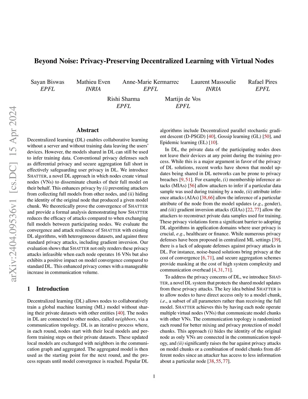 Decentralized learning (DL) enables collaborative learning without a server and without training data leaving the users' devices. However, the models shared in DL can still be used to infer training data. Conventional privacy defenses such as differential privacy and secure aggregation fall short in effectively safeguarding user privacy in DL. We introduce Shatter, a novel DL approach in which nodes create virtual nodes (VNs) to disseminate chunks of their full model on their behalf. This enhances privacy by (i) preventing attackers from collecting full models from other nodes, and (ii) hiding the identity of the original node that produced a given model chunk. We theoretically prove the convergence of Shatter and provide a formal analysis demonstrating how Shatter reduces the efficacy of attacks compared to when exchanging full models between participating nodes. We evaluate the convergence and attack resilience of Shatter with existing DL algorithms, with heterogeneous datasets, and against three standard privacy attacks, including gradient inversion. Our evaluation shows that Shatter not only renders these privacy attacks infeasible when each node operates 16 VNs but also exhibits a positive impact on model convergence compared to standard DL. This enhanced privacy comes with a manageable increase in communication volume.