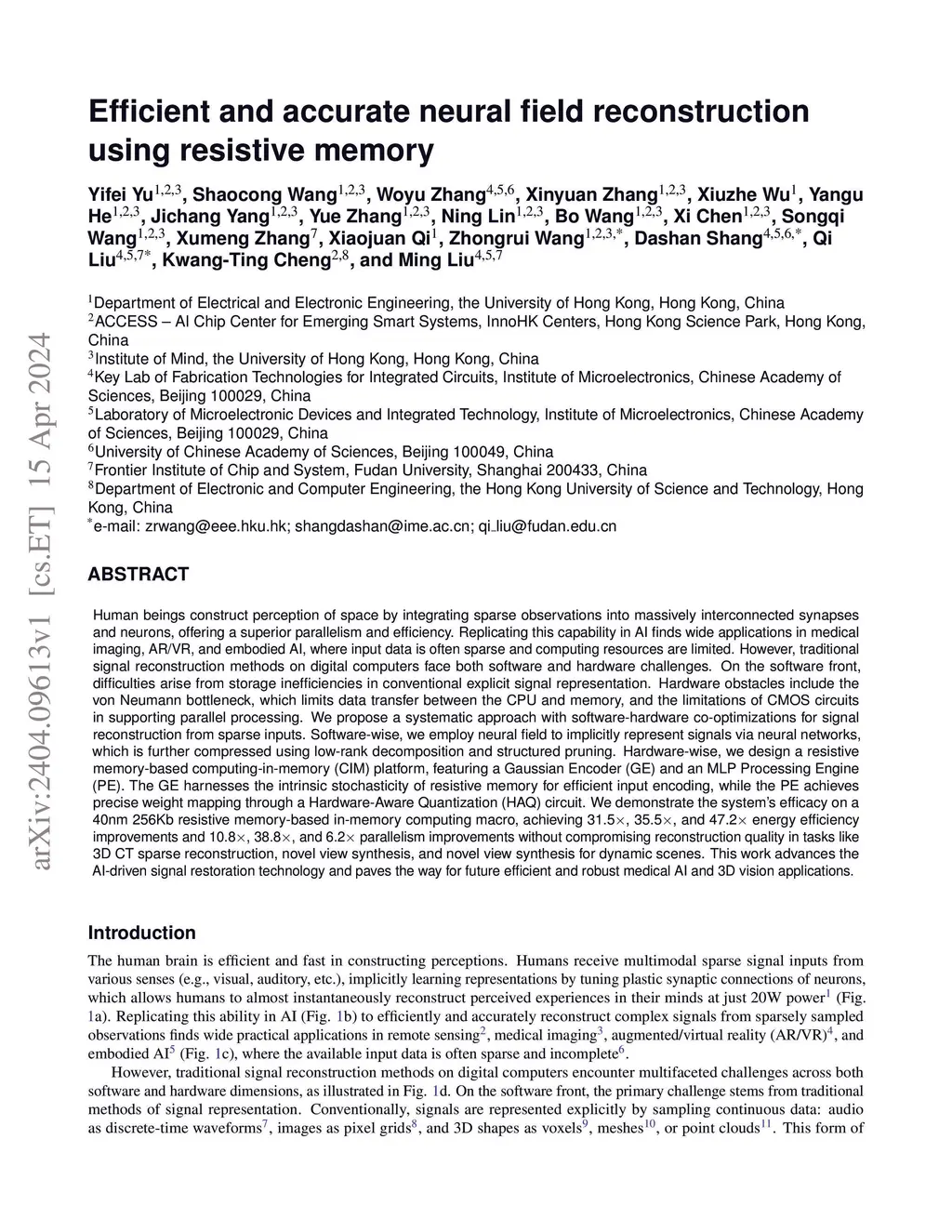Human beings construct perception of space by integrating sparse observations into massively interconnected synapses and neurons, offering a superior parallelism and efficiency. Replicating this capability in AI finds wide applications in medical imaging, AR/VR, and embodied AI, where input data is often sparse and computing resources are limited. However, traditional signal reconstruction methods on digital computers face both software and hardware challenges. On the software front, difficulties arise from storage inefficiencies in conventional explicit signal representation. Hardware obstacles include the von Neumann bottleneck, which limits data transfer between the CPU and memory, and the limitations of CMOS circuits in supporting parallel processing. We propose a systematic approach with software-hardware co-optimizations for signal reconstruction from sparse inputs. Software-wise, we employ neural field to implicitly represent signals via neural networks, which is further compressed using low-rank decomposition and structured pruning. Hardware-wise, we design a resistive memory-based computing-in-memory (CIM) platform, featuring a Gaussian Encoder (GE) and an MLP Processing Engine (PE). The GE harnesses the intrinsic stochasticity of resistive memory for efficient input encoding, while the PE achieves precise weight mapping through a Hardware-Aware Quantization (HAQ) circuit. We demonstrate the system's efficacy on a 40nm 256Kb resistive memory-based in-memory computing macro, achieving huge energy efficiency and parallelism improvements without compromising reconstruction quality in tasks like 3D CT sparse reconstruction, novel view synthesis, and novel view synthesis for dynamic scenes. This work advances the AI-driven signal restoration technology and paves the way for future efficient and robust medical AI and 3D vision applications.