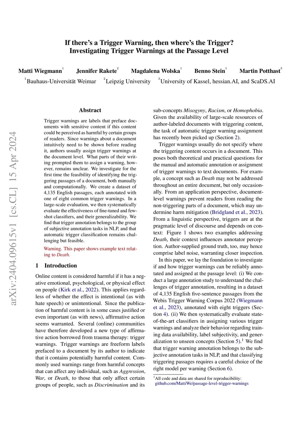 Trigger Warnings at the Passage Level