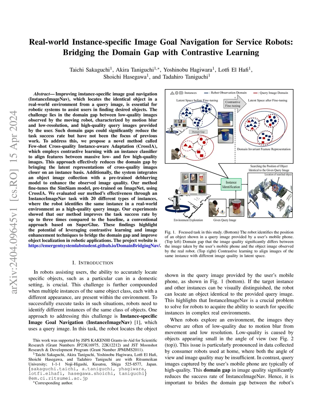 Improving instance-specific image goal navigation (InstanceImageNav), which locates the identical object in a real-world environment from a query image, is essential for robotic systems to assist users in finding desired objects. The challenge lies in the domain gap between low-quality images observed by the moving robot, characterized by motion blur and low-resolution, and high-quality query images provided by the user. Such domain gaps could significantly reduce the task success rate but have not been the focus of previous work. To address this, we propose a novel method called Few-shot Cross-quality Instance-aware Adaptation (CrossIA), which employs contrastive learning with an instance classifier to align features between massive low- and few high-quality images. This approach effectively reduces the domain gap by bringing the latent representations of cross-quality images closer on an instance basis. Additionally, the system integrates an object image collection with a pre-trained deblurring model to enhance the observed image quality. Our method fine-tunes the SimSiam model, pre-trained on ImageNet, using CrossIA. We evaluated our method's effectiveness through an InstanceImageNav task with 20 different types of instances, where the robot identifies the same instance in a real-world environment as a high-quality query image. Our experiments showed that our method improves the task success rate by up to three times compared to the baseline, a conventional approach based on SuperGlue. These findings highlight the potential of leveraging contrastive learning and image enhancement techniques to bridge the domain gap and improve object localization in robotic applications. The project website is https://emergentsystemlabstudent.github.io/DomainBridgingNav/.