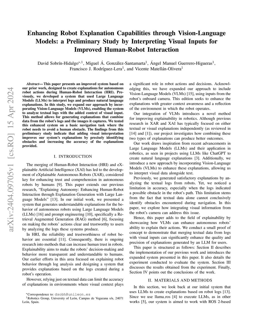 This paper presents an improved system based on our prior work, designed to create explanations for autonomous robot actions during Human-Robot Interaction (HRI). Previously, we developed a system that used Large Language Models (LLMs) to interpret logs and produce natural language explanations. In this study, we expand our approach by incorporating Vision-Language Models (VLMs), enabling the system to analyze textual logs with the added context of visual input. This method allows for generating explanations that combine data from the robot's logs and the images it captures. We tested this enhanced system on a basic navigation task where the robot needs to avoid a human obstacle. The findings from this preliminary study indicate that adding visual interpretation improves our system's explanations by precisely identifying obstacles and increasing the accuracy of the explanations provided.