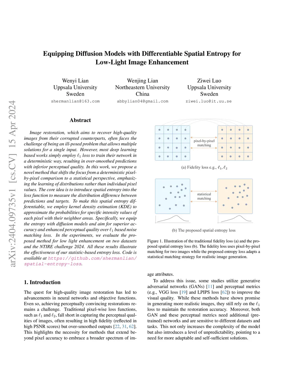 Image restoration, which aims to recover high-quality images from their corrupted counterparts, often faces the challenge of being an ill-posed problem that allows multiple solutions for a single input. However, most deep learning based works simply employ l1 loss to train their network in a deterministic way, resulting in over-smoothed predictions with inferior perceptual quality. In this work, we propose a novel method that shifts the focus from a deterministic pixel-by-pixel comparison to a statistical perspective, emphasizing the learning of distributions rather than individual pixel values. The core idea is to introduce spatial entropy into the loss function to measure the distribution difference between predictions and targets. To make this spatial entropy differentiable, we employ kernel density estimation (KDE) to approximate the probabilities for specific intensity values of each pixel with their neighbor areas. Specifically, we equip the entropy with diffusion models and aim for superior accuracy and enhanced perceptual quality over l1 based noise matching loss. In the experiments, we evaluate the proposed method for low light enhancement on two datasets and the NTIRE challenge 2024. All these results illustrate the effectiveness of our statistic-based entropy loss. Code is available at https://github.com/shermanlian/spatial-entropy-loss.