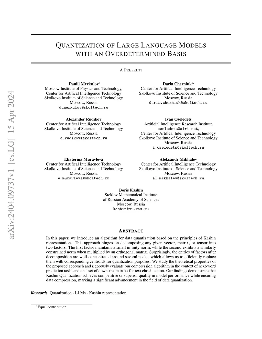 In this paper, we introduce an algorithm for data quantization based on the principles of Kashin representation. This approach hinges on decomposing any given vector, matrix, or tensor into two factors. The first factor maintains a small infinity norm, while the second exhibits a similarly constrained norm when multiplied by an orthogonal matrix. Surprisingly, the entries of factors after decomposition are well-concentrated around several peaks, which allows us to efficiently replace them with corresponding centroids for quantization purposes. We study the theoretical properties of the proposed approach and rigorously evaluate our compression algorithm in the context of next-word prediction tasks and on a set of downstream tasks for text classification. Our findings demonstrate that Kashin Quantization achieves competitive or superior quality in model performance while ensuring data compression, marking a significant advancement in the field of data quantization.