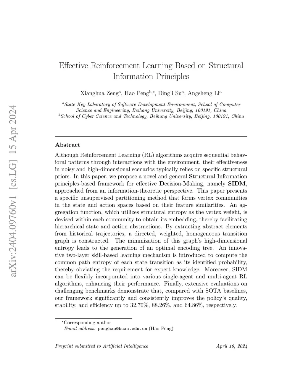 Hierarchical Reinforcement Learning (HRL) is a promising approach for managing task complexity across multiple levels of abstraction and accelerating long-horizon agent exploration. However, the effectiveness of hierarchical policies heavily depends on prior knowledge and manual assumptions about skill definitions and task decomposition. In this paper, we propose a novel Structural Information principles-based framework, namely SIDM, for hierarchical Decision Making in both single-agent and multi-agent scenarios. Central to our work is the utilization of structural information embedded in the decision-making process to adaptively and dynamically discover and learn hierarchical policies through environmental abstractions. Specifically, we present an abstraction mechanism that processes historical state-action trajectories to construct abstract representations of states and actions. We define and optimize directed structural entropy, a metric quantifying the uncertainty in transition dynamics between abstract states, to discover skills that capture key transition patterns in RL environments. Building on these findings, we develop a skill-based learning method for single-agent scenarios and a role-based collaboration method for multi-agent scenarios, both of which can flexibly integrate various underlying algorithms for enhanced performance. Extensive evaluations on challenging benchmarks demonstrate that our framework significantly and consistently outperforms state-of-the-art baselines, improving the effectiveness, efficiency, and stability of policy learning by up to 32.70%, 64.86%, and 88.26%, respectively, as measured by average rewards, convergence timesteps, and standard deviations.