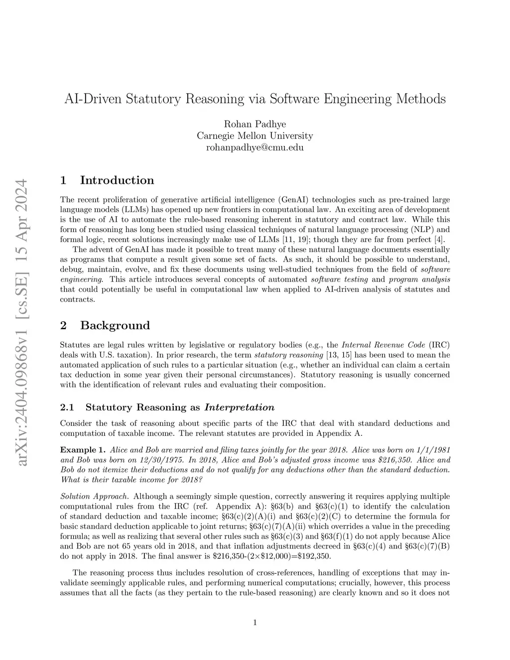 The recent proliferation of generative artificial intelligence (AI) technologies such as pre-trained large language models (LLMs) has opened up new frontiers in computational law. An exciting area of development is the use of AI to automate the deductive rule-based reasoning inherent in statutory and contract law. This paper argues that such automated deductive legal reasoning can now be viewed from the lens of software engineering, treating LLMs as interpreters of natural-language programs with natural-language inputs. We show how it is possible to apply principled software engineering techniques to enhance AI-driven legal reasoning of complex statutes and to unlock new applications in automated meta-reasoning such as mutation-guided example generation and metamorphic property-based testing.