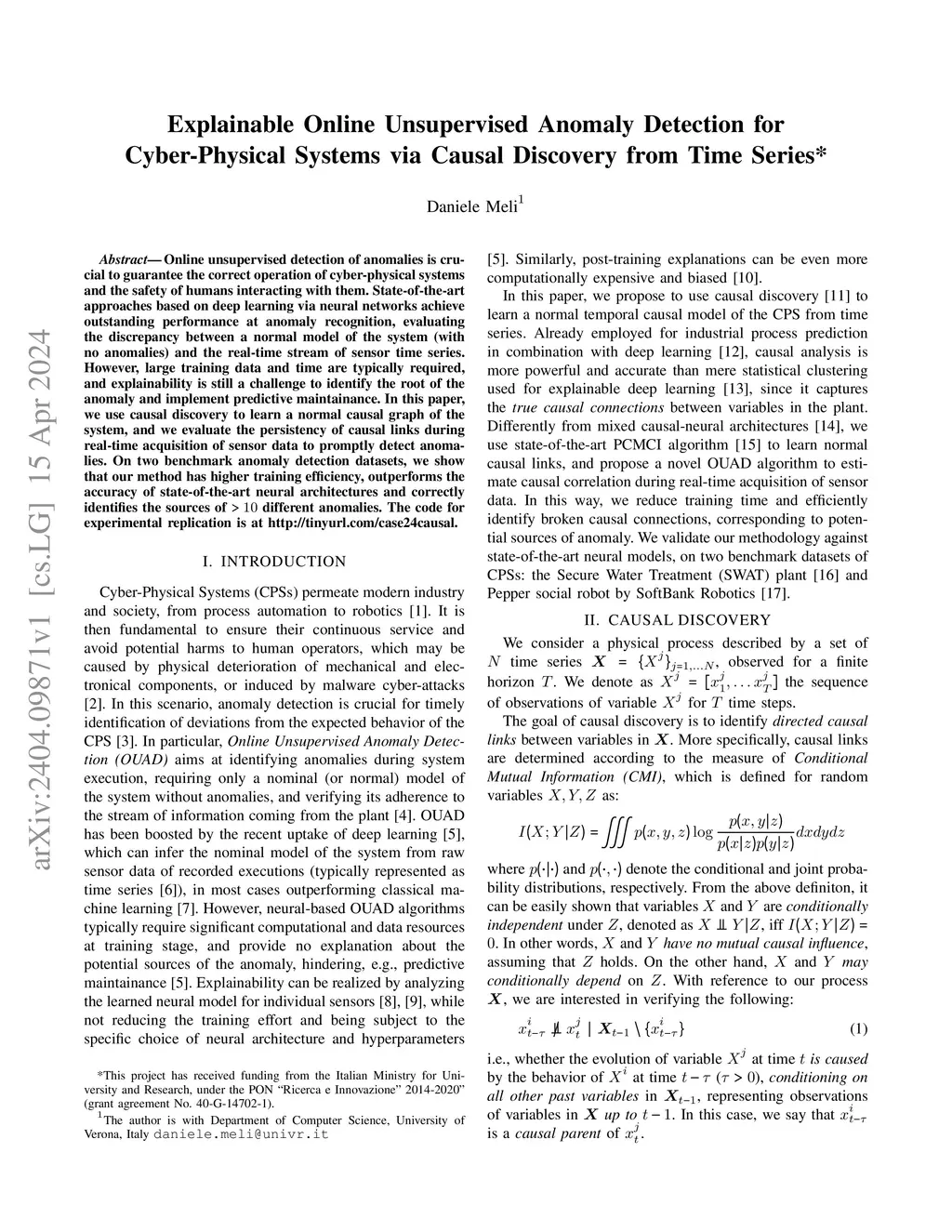 Online unsupervised detection of anomalies is crucial to guarantee the correct operation of cyber-physical systems and the safety of humans interacting with them. State-of-the-art approaches based on deep learning via neural networks achieve outstanding performance at anomaly recognition, evaluating the discrepancy between a normal model of the system (with no anomalies) and the real-time stream of sensor time series. However, large training data and time are typically required, and explainability is still a challenge to identify the root of the anomaly and implement predictive maintainance. In this paper, we use causal discovery to learn a normal causal graph of the system, and we evaluate the persistency of causal links during real-time acquisition of sensor data to promptly detect anomalies. On two benchmark anomaly detection datasets, we show that our method has higher training efficiency, outperforms the accuracy of state-of-the-art neural architectures and correctly identifies the sources of >10 different anomalies. The code is at https://github.com/Isla-lab/causal_anomaly_detection.