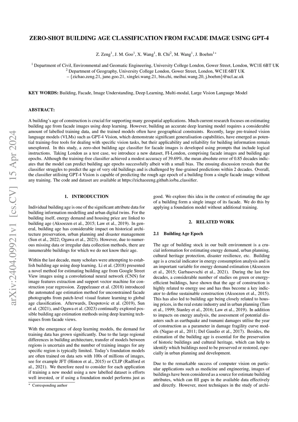 A building's age of construction is crucial for supporting many geospatial applications. Much current research focuses on estimating building age from facade images using deep learning. However, building an accurate deep learning model requires a considerable amount of labelled training data, and the trained models often have geographical constraints. Recently, large pre-trained vision language models (VLMs) such as GPT-4 Vision, which demonstrate significant generalisation capabilities, have emerged as potential training-free tools for dealing with specific vision tasks, but their applicability and reliability for building information remain unexplored. In this study, a zero-shot building age classifier for facade images is developed using prompts that include logical instructions. Taking London as a test case, we introduce a new dataset, FI-London, comprising facade images and building age epochs. Although the training-free classifier achieved a modest accuracy of 39.69%, the mean absolute error of 0.85 decades indicates that the model can predict building age epochs successfully albeit with a small bias. The ensuing discussion reveals that the classifier struggles to predict the age of very old buildings and is challenged by fine-grained predictions within 2 decades. Overall, the classifier utilising GPT-4 Vision is capable of predicting the rough age epoch of a building from a single facade image without any training.