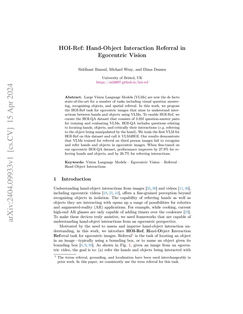 Large Vision Language Models (VLMs) are now the de facto state-of-the-art for a number of tasks including visual question answering, recognising objects, and spatial referral. In this work, we propose the HOI-Ref task for egocentric images that aims to understand interactions between hands and objects using VLMs. To enable HOI-Ref, we curate the HOI-QA dataset that consists of 3.9M question-answer pairs for training and evaluating VLMs. HOI-QA includes questions relating to locating hands, objects, and critically their interactions (e.g. referring to the object being manipulated by the hand). We train the first VLM for HOI-Ref on this dataset and call it VLM4HOI. Our results demonstrate that VLMs trained for referral on third person images fail to recognise and refer hands and objects in egocentric images. When fine-tuned on our egocentric HOI-QA dataset, performance improves by 27.9% for referring hands and objects, and by 26.7% for referring interactions.
