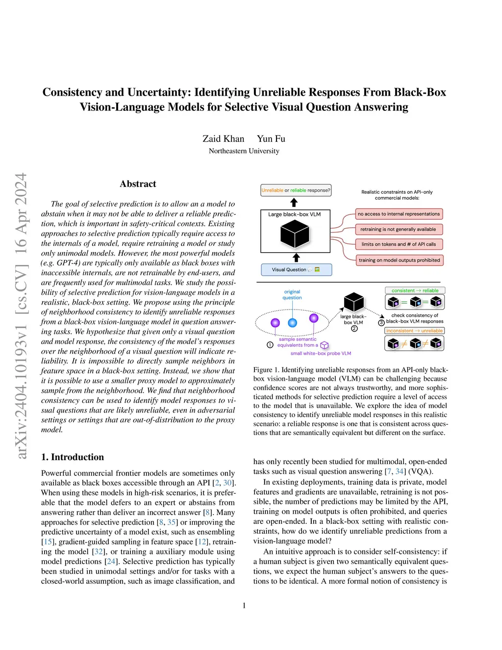 The goal of selective prediction is to allow an a model to abstain when it may not be able to deliver a reliable prediction, which is important in safety-critical contexts. Existing approaches to selective prediction typically require access to the internals of a model, require retraining a model or study only unimodal models. However, the most powerful models (e.g. GPT-4) are typically only available as black boxes with inaccessible internals, are not retrainable by end-users, and are frequently used for multimodal tasks. We study the possibility of selective prediction for vision-language models in a realistic, black-box setting. We propose using the principle of \textit{neighborhood consistency} to identify unreliable responses from a black-box vision-language model in question answering tasks. We hypothesize that given only a visual question and model response, the consistency of the model's responses over the neighborhood of a visual question will indicate reliability. It is impossible to directly sample neighbors in feature space in a black-box setting. Instead, we show that it is possible to use a smaller proxy model to approximately sample from the neighborhood. We find that neighborhood consistency can be used to identify model responses to visual questions that are likely unreliable, even in adversarial settings or settings that are out-of-distribution to the proxy model.