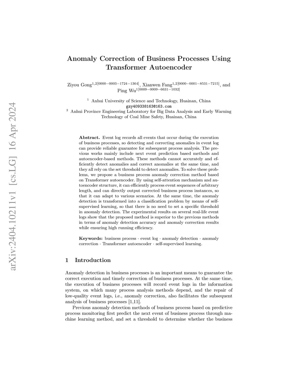 Event log records all events that occur during the execution of business processes, so detecting and correcting anomalies in event log can provide reliable guarantee for subsequent process analysis. The previous works mainly include next event prediction based methods and autoencoder-based methods. These methods cannot accurately and efficiently detect anomalies and correct anomalies at the same time, and they all rely on the set threshold to detect anomalies. To solve these problems, we propose a business process anomaly correction method based on Transformer autoencoder. By using self-attention mechanism and autoencoder structure, it can efficiently process event sequences of arbitrary length, and can directly output corrected business process instances, so that it can adapt to various scenarios. At the same time, the anomaly detection is transformed into a classification problem by means of selfsupervised learning, so that there is no need to set a specific threshold in anomaly detection. The experimental results on several real-life event logs show that the proposed method is superior to the previous methods in terms of anomaly detection accuracy and anomaly correction results while ensuring high running efficiency.