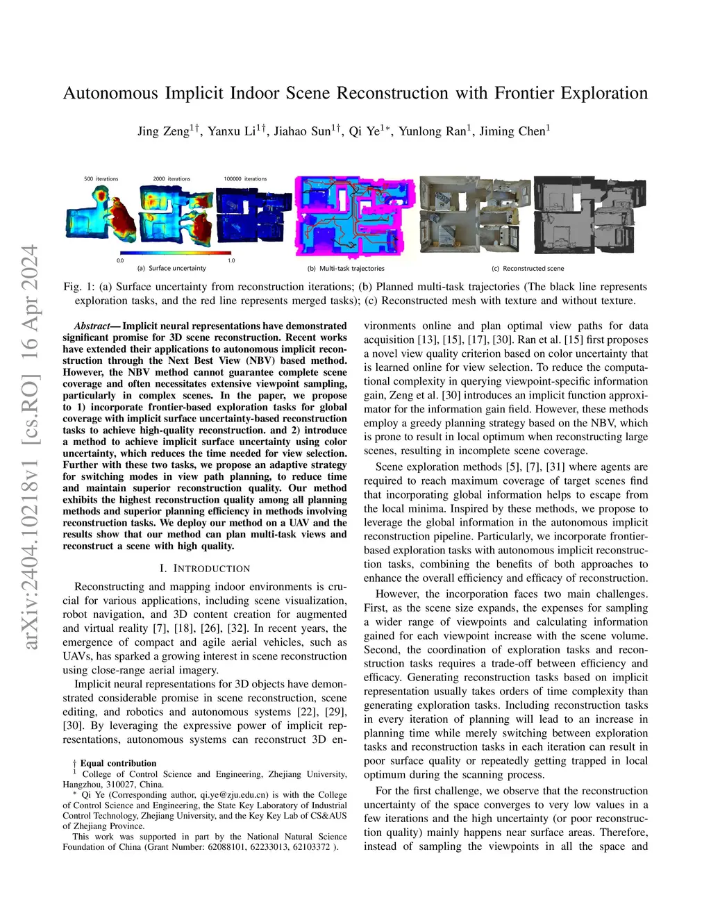 Implicit neural representations have demonstrated significant promise for 3D scene reconstruction. Recent works have extended their applications to autonomous implicit reconstruction through the Next Best View (NBV) based method. However, the NBV method cannot guarantee complete scene coverage and often necessitates extensive viewpoint sampling, particularly in complex scenes. In the paper, we propose to 1) incorporate frontier-based exploration tasks for global coverage with implicit surface uncertainty-based reconstruction tasks to achieve high-quality reconstruction. and 2) introduce a method to achieve implicit surface uncertainty using color uncertainty, which reduces the time needed for view selection. Further with these two tasks, we propose an adaptive strategy for switching modes in view path planning, to reduce time and maintain superior reconstruction quality. Our method exhibits the highest reconstruction quality among all planning methods and superior planning efficiency in methods involving reconstruction tasks. We deploy our method on a UAV and the results show that our method can plan multi-task views and reconstruct a scene with high quality.