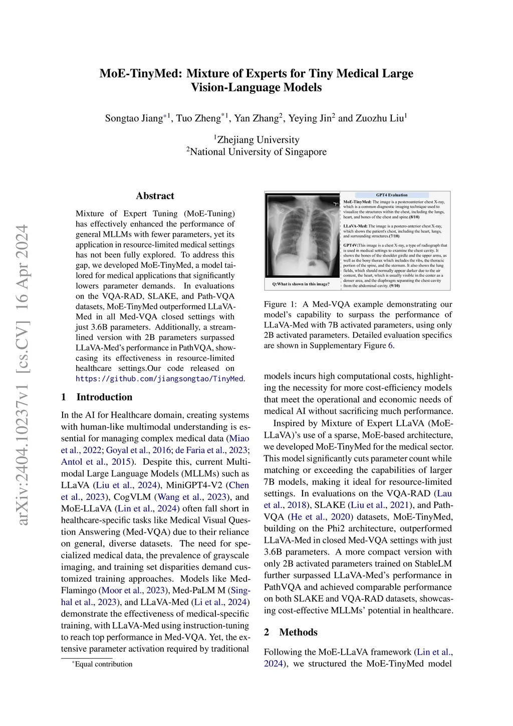 Recent advancements in general-purpose or domain-specific multimodal large language models (LLMs) have witnessed remarkable progress for medical decision-making. However, they are designated for specific classification or generative tasks, and require model training or finetuning on large-scale datasets with sizeable parameters and tremendous computing, hindering their clinical utility across diverse resource-constrained scenarios in practice. In this paper, we propose a novel and lightweight framework Med-MoE (Mixture-of-Experts) that tackles both discriminative and generative multimodal medical tasks. The learning of Med-MoE consists of three steps: multimodal medical alignment, instruction tuning and routing, and domain-specific MoE tuning. After aligning multimodal medical images with LLM tokens, we then enable the model for different multimodal medical tasks with instruction tuning, together with a trainable router tailored for expert selection across input modalities. Finally, the model is tuned by integrating the router with multiple domain-specific experts, which are selectively activated and further empowered by meta expert. Comprehensive experiments on both open- and close-end medical question answering (Med-VQA) and image classification tasks across datasets such as VQA-RAD, SLAKE and Path-VQA demonstrate that our model can achieve performance superior to or on par with state-of-the-art baselines, while only requiring approximately 30\%-50\% of activated model parameters. Extensive analysis and ablations corroborate the effectiveness and practical utility of our method.