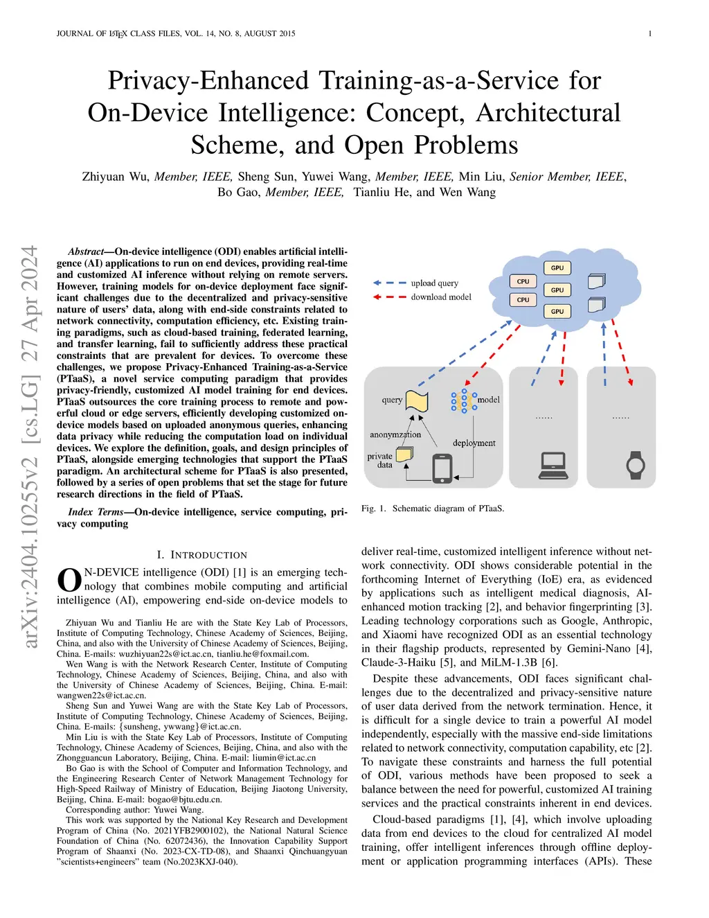 On-device intelligence (ODI) enables artificial intelligence (AI) applications to run on end devices, providing real-time and customized AI inference without relying on remote servers. However, training models for on-device deployment face significant challenges due to the decentralized and privacy-sensitive nature of users' data, along with end-side constraints related to network connectivity, computation efficiency, etc. Existing training paradigms, such as cloud-based training, federated learning, and transfer learning, fail to sufficiently address these practical constraints that are prevalent for devices. To overcome these challenges, we propose Privacy-Enhanced Training-as-a-Service (PTaaS), a novel service computing paradigm that provides privacy-friendly, customized AI model training for end devices. PTaaS outsources the core training process to remote and powerful cloud or edge servers, efficiently developing customized on-device models based on uploaded anonymous queries, enhancing data privacy while reducing the computation load on individual devices. We explore the definition, goals, and design principles of PTaaS, alongside emerging technologies that support the PTaaS paradigm. An architectural scheme for PTaaS is also presented, followed by a series of open problems that set the stage for future research directions in the field of PTaaS.