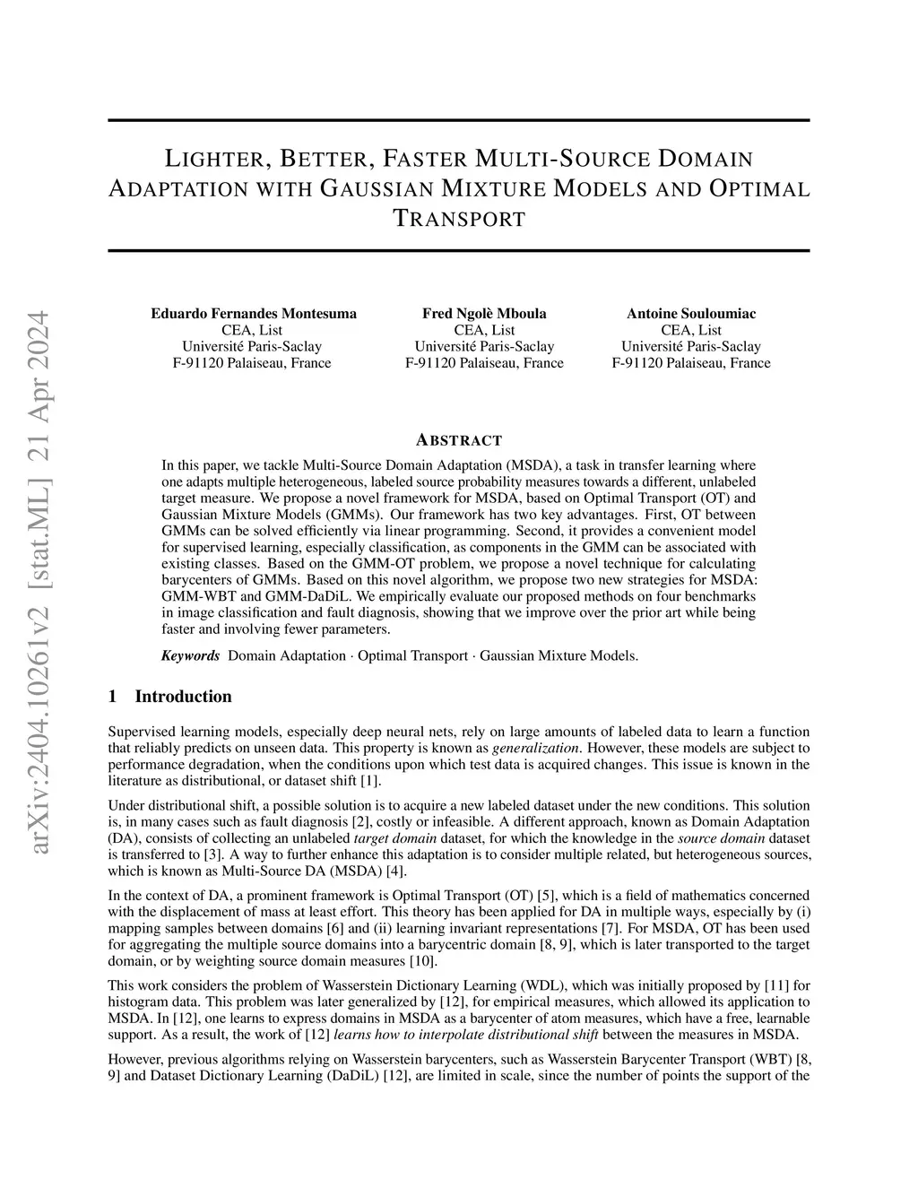 In this paper, we tackle Multi-Source Domain Adaptation (MSDA), a task in transfer learning where one adapts multiple heterogeneous, labeled source probability measures towards a different, unlabeled target measure. We propose a novel framework for MSDA, based on Optimal Transport (OT) and Gaussian Mixture Models (GMMs). Our framework has two key advantages. First, OT between GMMs can be solved efficiently via linear programming. Second, it provides a convenient model for supervised learning, especially classification, as components in the GMM can be associated with existing classes. Based on the GMM-OT problem, we propose a novel technique for calculating barycenters of GMMs. Based on this novel algorithm, we propose two new strategies for MSDA: GMM-WBT and GMM-DaDiL. We empirically evaluate our proposed methods on four benchmarks in image classification and fault diagnosis, showing that we improve over the prior art while being faster and involving fewer parameters.