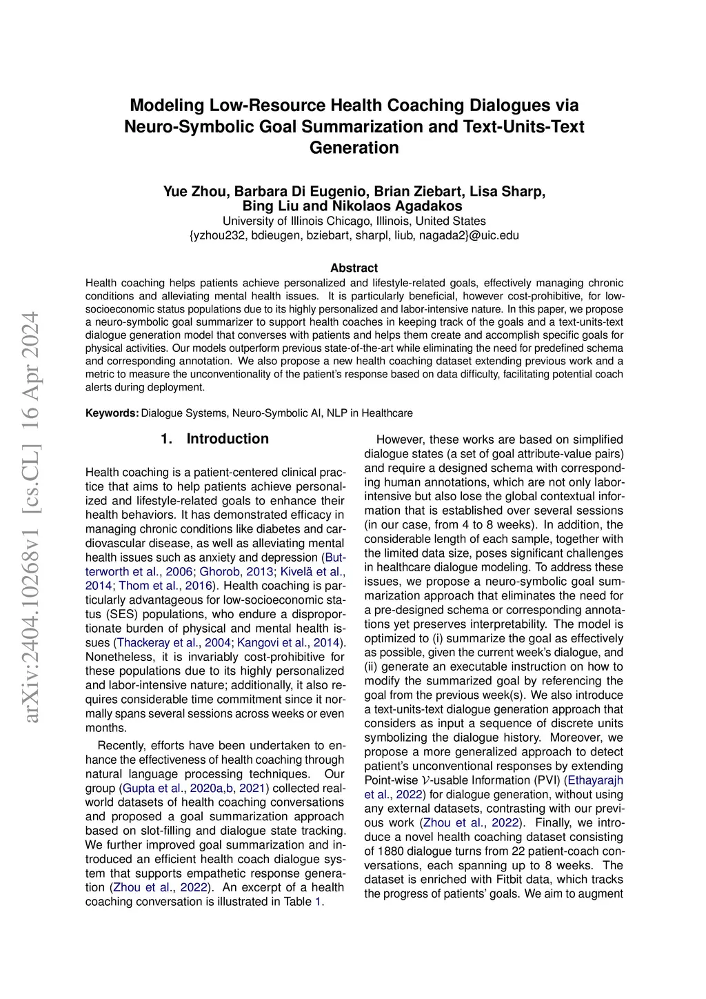 Health coaching helps patients achieve personalized and lifestyle-related goals, effectively managing chronic conditions and alleviating mental health issues. It is particularly beneficial, however cost-prohibitive, for low-socioeconomic status populations due to its highly personalized and labor-intensive nature. In this paper, we propose a neuro-symbolic goal summarizer to support health coaches in keeping track of the goals and a text-units-text dialogue generation model that converses with patients and helps them create and accomplish specific goals for physical activities. Our models outperform previous state-of-the-art while eliminating the need for predefined schema and corresponding annotation. We also propose a new health coaching dataset extending previous work and a metric to measure the unconventionality of the patient's response based on data difficulty, facilitating potential coach alerts during deployment.