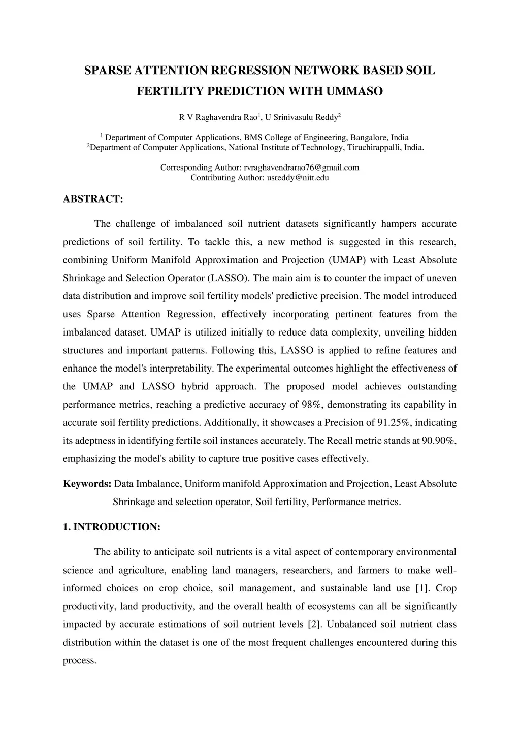 The challenge of imbalanced soil nutrient datasets significantly hampers accurate predictions of soil fertility. To tackle this, a new method is suggested in this research, combining Uniform Manifold Approximation and Projection (UMAP) with Least Absolute Shrinkage and Selection Operator (LASSO). The main aim is to counter the impact of uneven data distribution and improve soil fertility models' predictive precision. The model introduced uses Sparse Attention Regression, effectively incorporating pertinent features from the imbalanced dataset. UMAP is utilized initially to reduce data complexity, unveiling hidden structures and important patterns. Following this, LASSO is applied to refine features and enhance the model's interpretability. The experimental outcomes highlight the effectiveness of the UMAP and LASSO hybrid approach. The proposed model achieves outstanding performance metrics, reaching a predictive accuracy of 98%, demonstrating its capability in accurate soil fertility predictions. Additionally, it showcases a Precision of 91.25%, indicating its adeptness in identifying fertile soil instances accurately. The Recall metric stands at 90.90%, emphasizing the model's ability to capture true positive cases effectively.