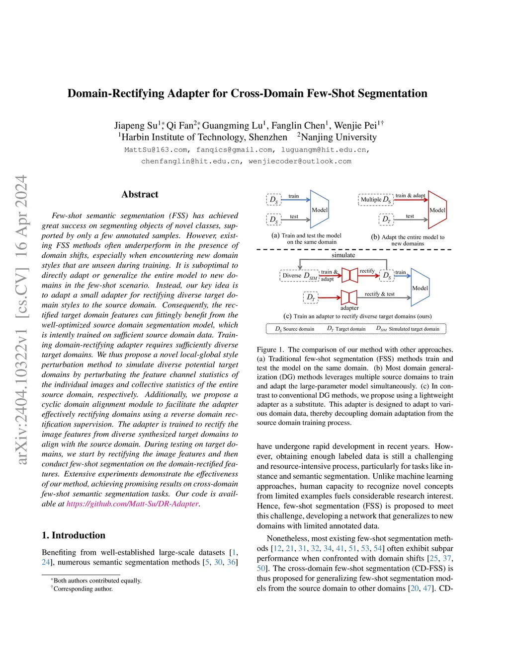 Few-shot semantic segmentation (FSS) has achieved great success on segmenting objects of novel classes, supported by only a few annotated samples. However, existing FSS methods often underperform in the presence of domain shifts, especially when encountering new domain styles that are unseen during training. It is suboptimal to directly adapt or generalize the entire model to new domains in the few-shot scenario. Instead, our key idea is to adapt a small adapter for rectifying diverse target domain styles to the source domain. Consequently, the rectified target domain features can fittingly benefit from the well-optimized source domain segmentation model, which is intently trained on sufficient source domain data. Training domain-rectifying adapter requires sufficiently diverse target domains. We thus propose a novel local-global style perturbation method to simulate diverse potential target domains by perturbating the feature channel statistics of the individual images and collective statistics of the entire source domain, respectively. Additionally, we propose a cyclic domain alignment module to facilitate the adapter effectively rectifying domains using a reverse domain rectification supervision. The adapter is trained to rectify the image features from diverse synthesized target domains to align with the source domain. During testing on target domains, we start by rectifying the image features and then conduct few-shot segmentation on the domain-rectified features. Extensive experiments demonstrate the effectiveness of our method, achieving promising results on cross-domain few-shot semantic segmentation tasks. Our code is available at https://github.com/Matt-Su/DR-Adapter.