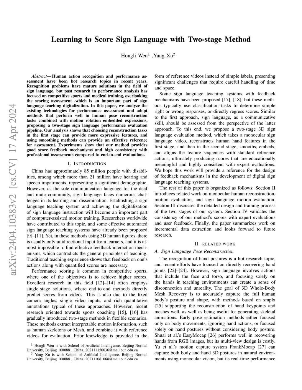 Human action recognition and performance assessment have been hot research topics in recent years. Recognition problems have mature solutions in the field of sign language, but past research in performance analysis has focused on competitive sports and medical training, overlooking the scoring assessment ,which is an important part of sign language teaching digitalization. In this paper, we analyze the existing technologies for performance assessment and adopt methods that perform well in human pose reconstruction tasks combined with motion rotation embedded expressions, proposing a two-stage sign language performance evaluation pipeline. Our analysis shows that choosing reconstruction tasks in the first stage can provide more expressive features, and using smoothing methods can provide an effective reference for assessment. Experiments show that our method provides good score feedback mechanisms and high consistency with professional assessments compared to end-to-end evaluations.