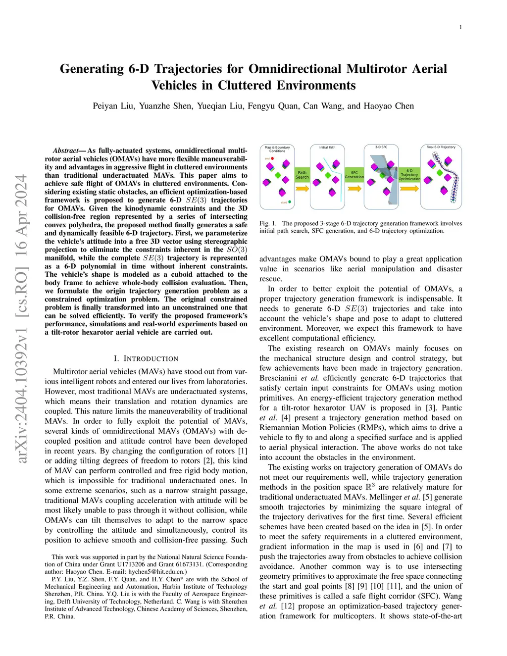 As fully-actuated systems, omnidirectional multirotor aerial vehicles (OMAVs) have more flexible maneuverability and advantages in aggressive flight in cluttered environments than traditional underactuated MAVs. %Due to the high dimensionality of configuration space, making the designed trajectory generation algorithm efficient is challenging. This paper aims to achieve safe flight of OMAVs in cluttered environments. Considering existing static obstacles, an efficient optimization-based framework is proposed to generate 6-D trajectories for OMAVs. Given the kinodynamic constraints and the 3D collision-free region represented by a series of intersecting convex polyhedra, the proposed method finally generates a safe and dynamically feasible 6-D trajectory. First, we parameterize the vehicle's attitude into a free 3D vector using stereographic projection to eliminate the constraints inherent in the manifold, while the complete trajectory is represented as a 6-D polynomial in time without inherent constraints. The vehicle's shape is modeled as a cuboid attached to the body frame to achieve whole-body collision evaluation. Then, we formulate the origin trajectory generation problem as a constrained optimization problem. The original constrained problem is finally transformed into an unconstrained one that can be solved efficiently. To verify the proposed framework's performance, simulations and real-world experiments based on a tilt-rotor hexarotor aerial vehicle are carried out.