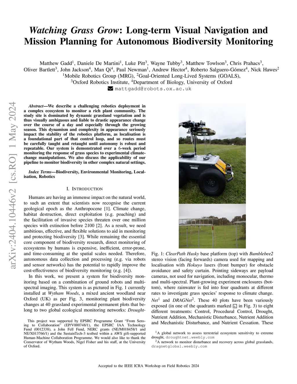 We describe a challenging robotics deployment in a complex ecosystem to monitor a rich plant community. The study site is dominated by dynamic grassland vegetation and is thus visually ambiguous and liable to drastic appearance change over the course of a day and especially through the growing season. This dynamism and complexity in appearance seriously impact the stability of the robotics platform, as localisation is a foundational part of that control loop, and so routes must be carefully taught and retaught until autonomy is robust and repeatable. Our system is demonstrated over a 6-week period monitoring the response of grass species to experimental climate change manipulations. We also discuss the applicability of our pipeline to monitor biodiversity in other complex natural settings.