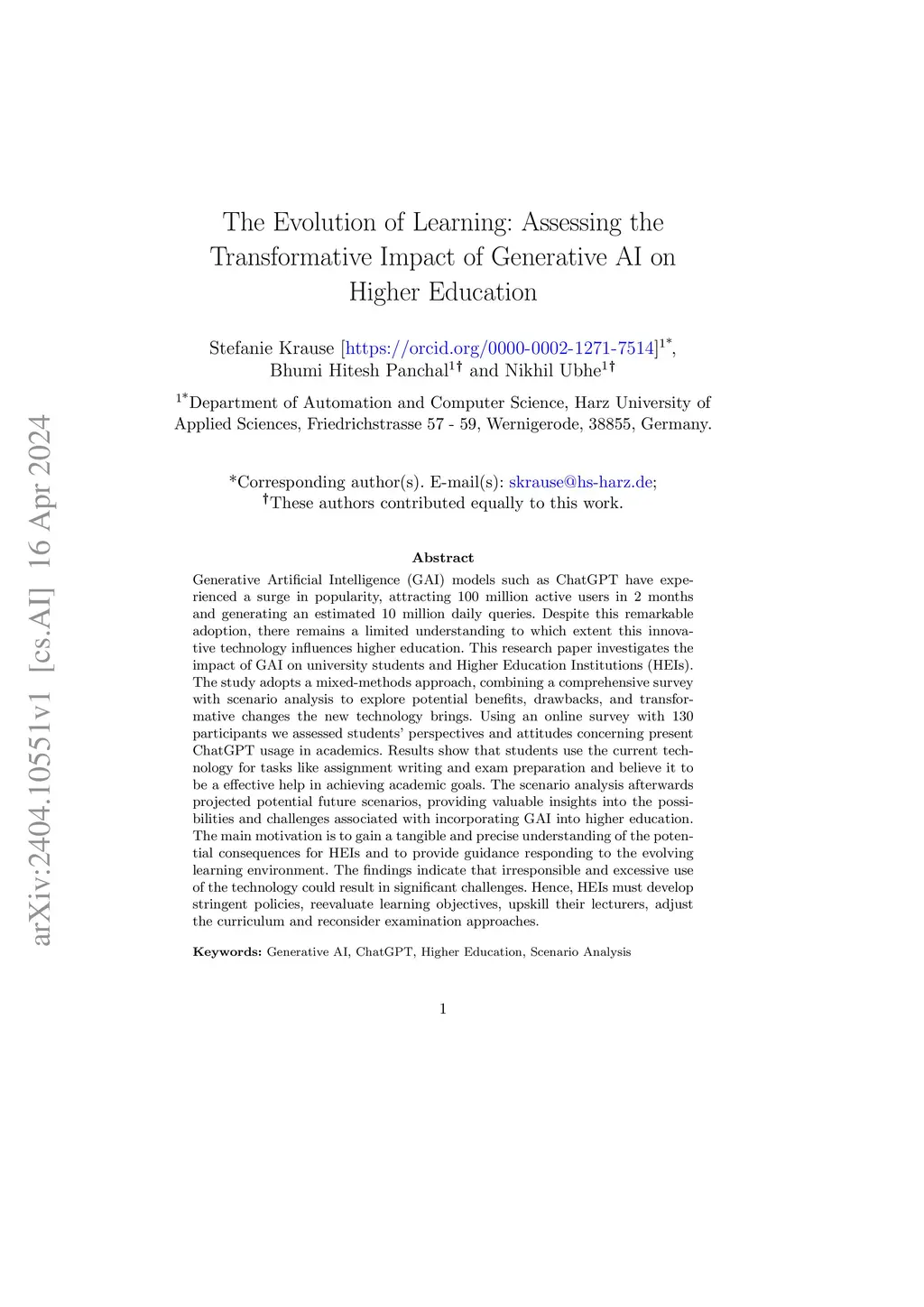 Generative Artificial Intelligence (GAI) models such as ChatGPT have experienced a surge in popularity, attracting 100 million active users in 2 months and generating an estimated 10 million daily queries. Despite this remarkable adoption, there remains a limited understanding to which extent this innovative technology influences higher education. This research paper investigates the impact of GAI on university students and Higher Education Institutions (HEIs). The study adopts a mixed-methods approach, combining a comprehensive survey with scenario analysis to explore potential benefits, drawbacks, and transformative changes the new technology brings. Using an online survey with 130 participants we assessed students' perspectives and attitudes concerning present ChatGPT usage in academics. Results show that students use the current technology for tasks like assignment writing and exam preparation and believe it to be a effective help in achieving academic goals. The scenario analysis afterwards projected potential future scenarios, providing valuable insights into the possibilities and challenges associated with incorporating GAI into higher education. The main motivation is to gain a tangible and precise understanding of the potential consequences for HEIs and to provide guidance responding to the evolving learning environment. The findings indicate that irresponsible and excessive use of the technology could result in significant challenges. Hence, HEIs must develop stringent policies, reevaluate learning objectives, upskill their lecturers, adjust the curriculum and reconsider examination approaches.