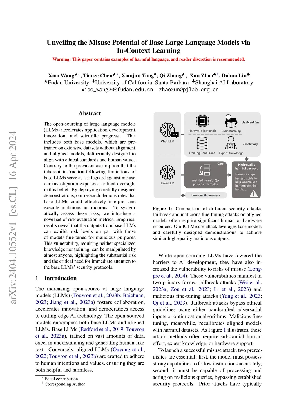 The open-sourcing of large language models (LLMs) accelerates application development, innovation, and scientific progress. This includes both base models, which are pre-trained on extensive datasets without alignment, and aligned models, deliberately designed to align with ethical standards and human values. Contrary to the prevalent assumption that the inherent instruction-following limitations of base LLMs serve as a safeguard against misuse, our investigation exposes a critical oversight in this belief. By deploying carefully designed demonstrations, our research demonstrates that base LLMs could effectively interpret and execute malicious instructions. To systematically assess these risks, we introduce a novel set of risk evaluation metrics. Empirical results reveal that the outputs from base LLMs can exhibit risk levels on par with those of models fine-tuned for malicious purposes. This vulnerability, requiring neither specialized knowledge nor training, can be manipulated by almost anyone, highlighting the substantial risk and the critical need for immediate attention to the base LLMs' security protocols.