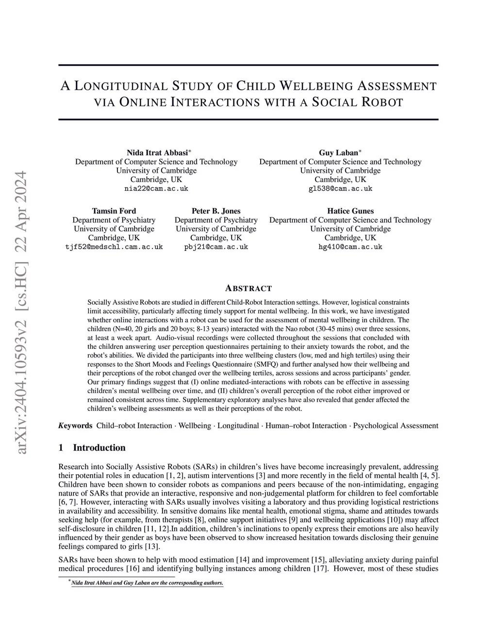 Socially Assistive Robots are studied in different Child-Robot Interaction settings. However, logistical constraints limit accessibility, particularly affecting timely support for mental wellbeing. In this work, we have investigated whether online interactions with a robot can be used for the assessment of mental wellbeing in children. The children (N=40, 20 girls and 20 boys; 8-13 years) interacted with the Nao robot (30-45 mins) over three sessions, at least a week apart. Audio-visual recordings were collected throughout the sessions that concluded with the children answering user perception questionnaires pertaining to their anxiety towards the robot, and the robot's abilities. We divided the participants into three wellbeing clusters (low, med and high tertiles) using their responses to the Short Moods and Feelings Questionnaire (SMFQ) and further analysed how their wellbeing and their perceptions of the robot changed over the wellbeing tertiles, across sessions and across participants' gender. Our primary findings suggest that (I) online mediated-interactions with robots can be effective in assessing children's mental wellbeing over time, and (II) children's overall perception of the robot either improved or remained consistent across time. Supplementary exploratory analyses have also revealed that gender affected the children's wellbeing assessments as well as their perceptions of the robot.