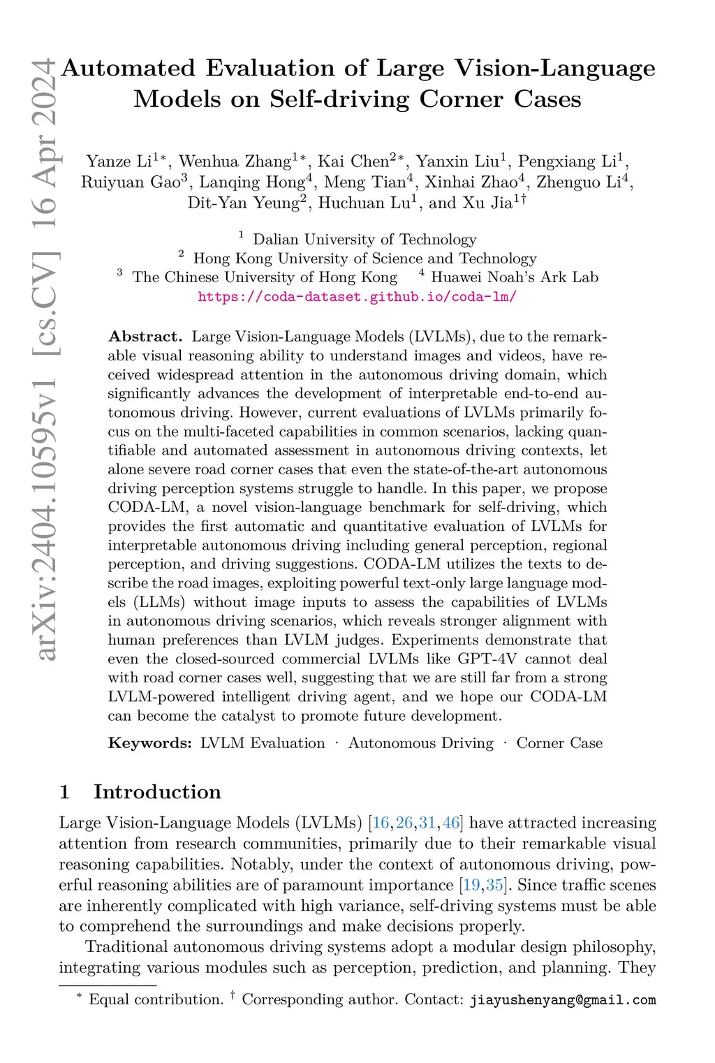 Large Vision-Language Models (LVLMs) have received widespread attention in advancing the interpretable self-driving. Existing evaluations of LVLMs primarily focus on the multi-faceted capabilities in natural circumstances, lacking automated and quantifiable assessment for self-driving, let alone the severe road corner cases. In this paper, we propose CODA-LM, the very first benchmark for the automatic evaluation of LVLMs for self-driving corner cases. We adopt a hierarchical data structure to prompt powerful LVLMs to analyze complex driving scenes and generate high-quality pre-annotation for human annotators, and for LVLM evaluation, we show that using the text-only large language models (LLMs) as judges reveals even better alignment with human preferences than the LVLM judges. Moreover, with CODA-LM, we build CODA-VLM, a new driving LVLM surpassing all the open-sourced counterparts on CODA-LM. Our CODA-VLM performs comparably with GPT-4V, even surpassing GPT-4V by +21.42% on the regional perception task. We hope CODA-LM can become the catalyst to promote interpretable self-driving empowered by LVLMs.