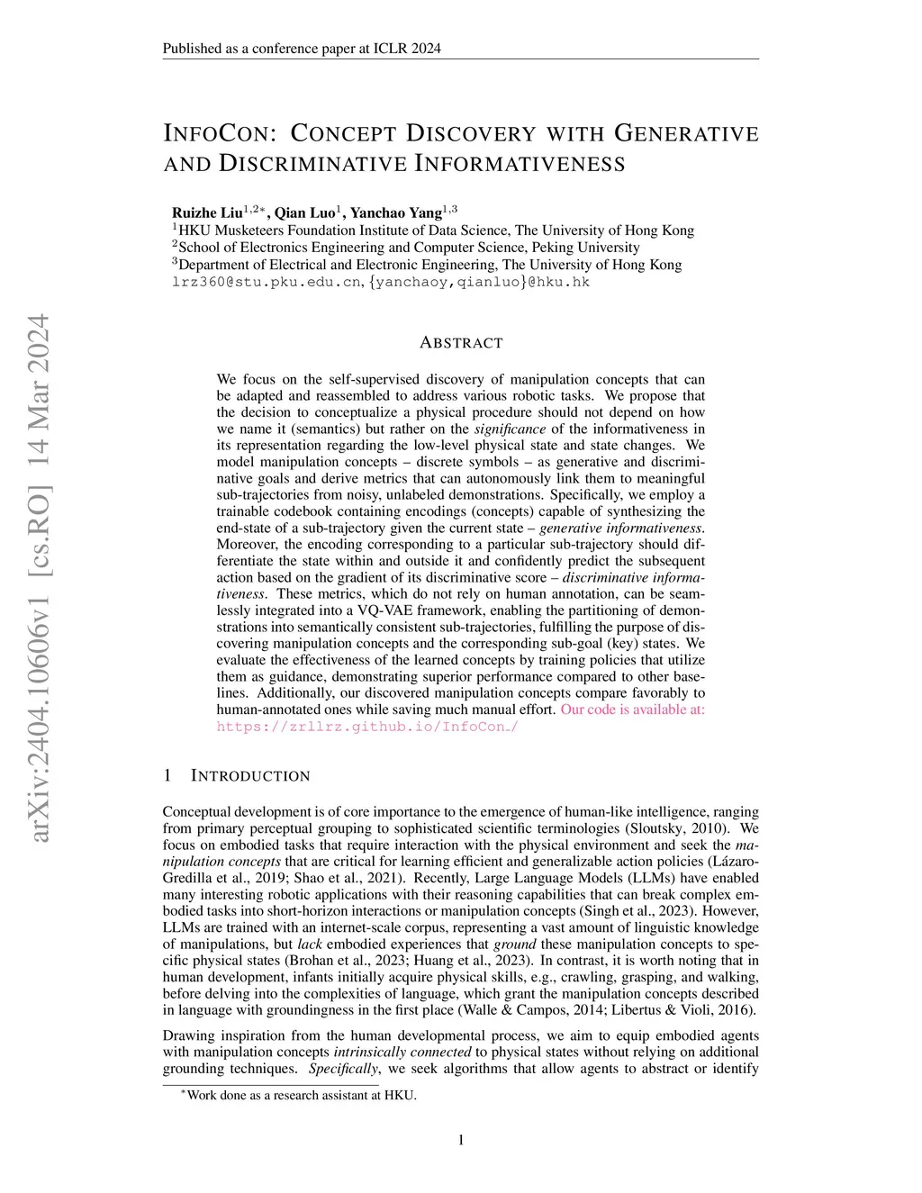 We focus on the self-supervised discovery of manipulation concepts that can be adapted and reassembled to address various robotic tasks. We propose that the decision to conceptualize a physical procedure should not depend on how we name it (semantics) but rather on the significance of the informativeness in its representation regarding the low-level physical state and state changes. We model manipulation concepts (discrete symbols) as generative and discriminative goals and derive metrics that can autonomously link them to meaningful sub-trajectories from noisy, unlabeled demonstrations. Specifically, we employ a trainable codebook containing encodings (concepts) capable of synthesizing the end-state of a sub-trajectory given the current state (generative informativeness). Moreover, the encoding corresponding to a particular sub-trajectory should differentiate the state within and outside it and confidently predict the subsequent action based on the gradient of its discriminative score (discriminative informativeness). These metrics, which do not rely on human annotation, can be seamlessly integrated into a VQ-VAE framework, enabling the partitioning of demonstrations into semantically consistent sub-trajectories, fulfilling the purpose of discovering manipulation concepts and the corresponding sub-goal (key) states. We evaluate the effectiveness of the learned concepts by training policies that utilize them as guidance, demonstrating superior performance compared to other baselines. Additionally, our discovered manipulation concepts compare favorably to human-annotated ones while saving much manual effort.