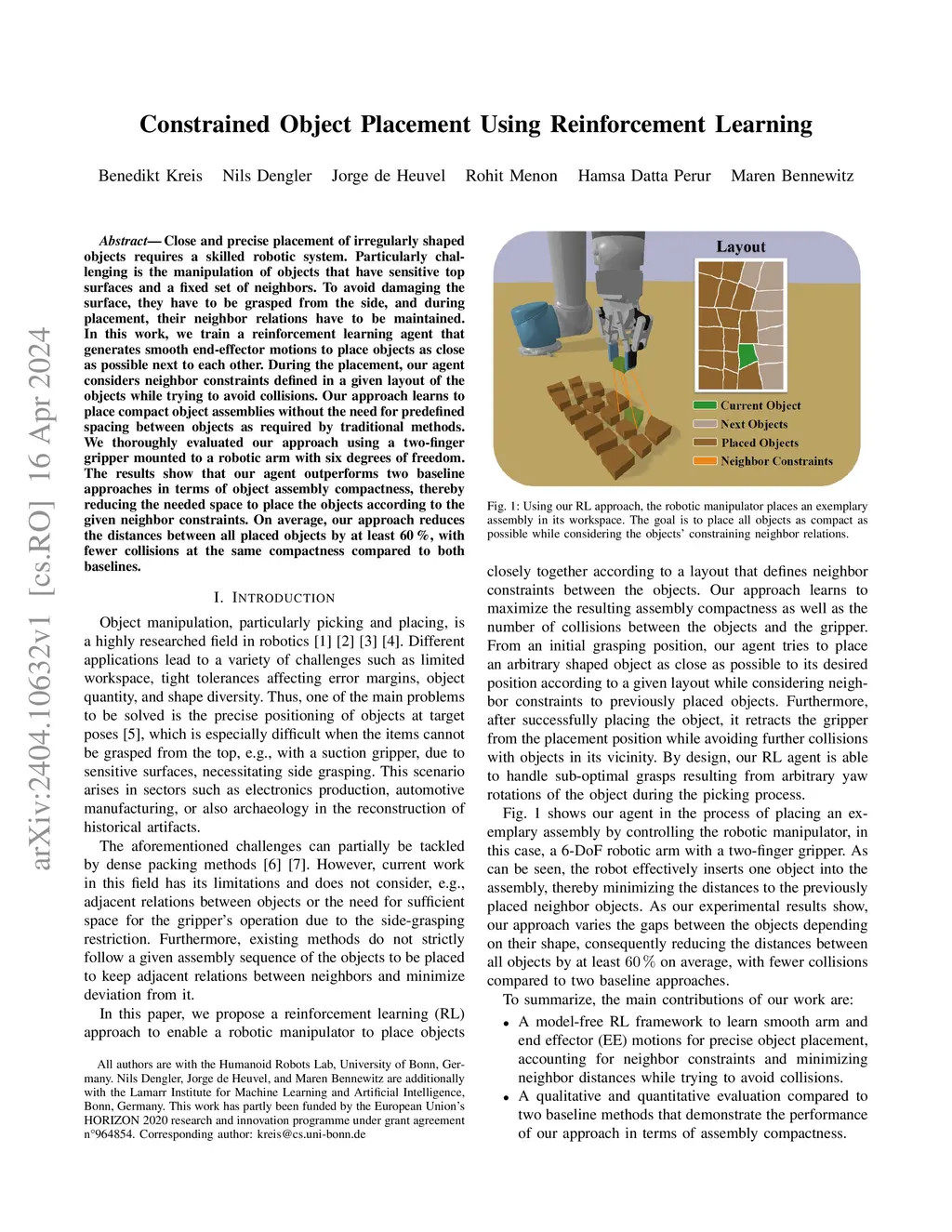 Close and precise placement of irregularly shaped objects requires a skilled robotic system. The manipulation of objects that have sensitive top surfaces and a fixed set of neighbors is particularly challenging. To avoid damaging the surface, the robot has to grasp them from the side, and during placement, it has to maintain the spatial relations with adjacent objects, while considering the physical gripper extent. In this work, we propose a framework to learn an agent based on reinforcement learning that generates end-effector motions to place objects as close as possible next to each other. During the placement, our agent considers the spatial constraints with neighbors defined in a given layout of the objects while avoiding collisions. Our approach learns to place compact object assemblies without the need for predefined spacing between objects as required by traditional methods. We thoroughly evaluated our approach using a two-finger gripper mounted on a robotic arm with six degrees of freedom. The results show that our agent significantly outperforms two baseline approaches in object assembly compactness, thereby reducing the space required to place the objects according to the specified spatial constraints with the neighboring placed objects.