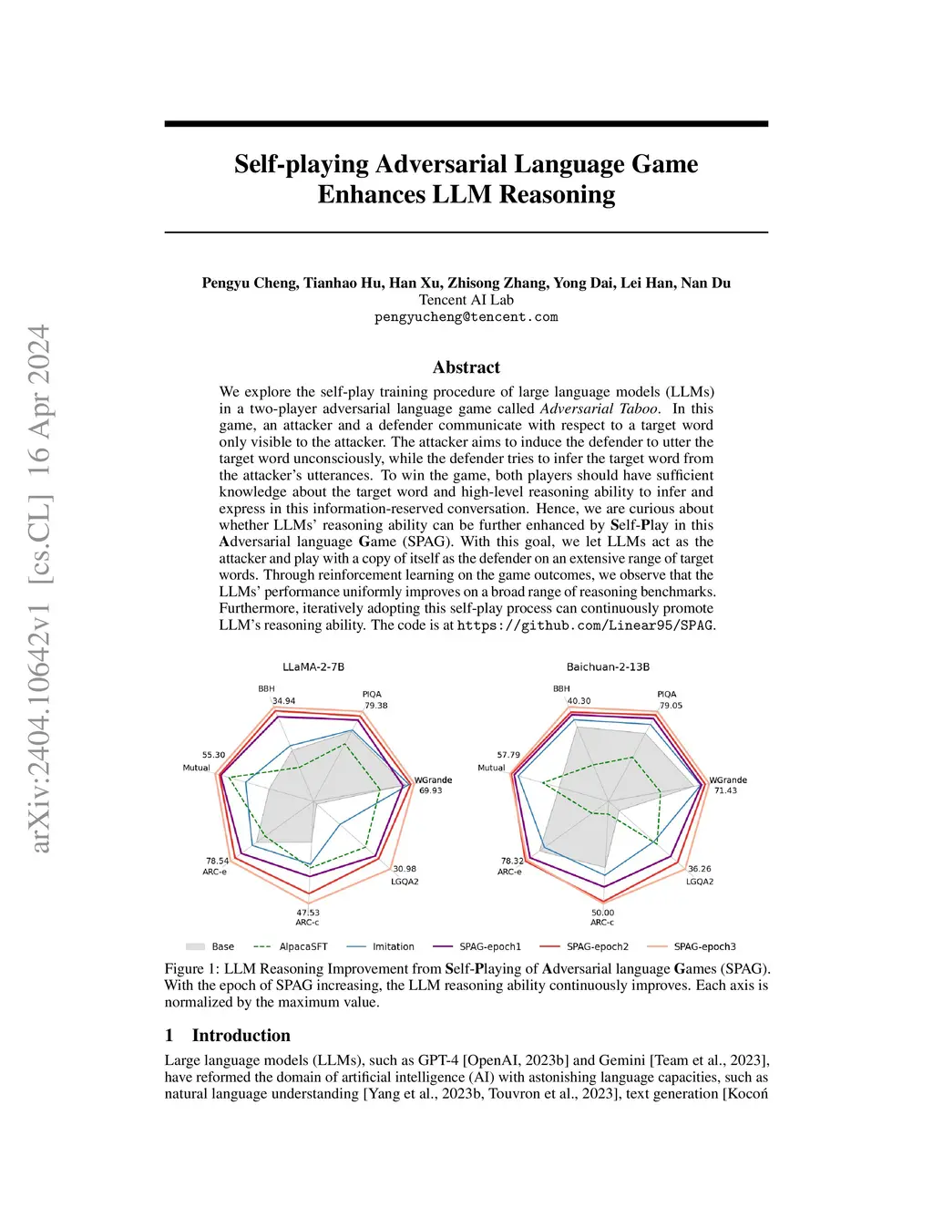 We explore the potential of self-play training for large language models (LLMs) in a two-player adversarial language game called Adversarial Taboo. In this game, an attacker and a defender communicate around a target word only visible to the attacker. The attacker aims to induce the defender to speak the target word unconsciously, while the defender tries to infer the target word from the attacker's utterances. To win the game, both players must have sufficient knowledge about the target word and high-level reasoning ability to infer and express in this information-reserved conversation. Hence, we are curious about whether LLMs' reasoning ability can be further enhanced by Self-Playing this Adversarial language Game (SPAG). With this goal, we select several open-source LLMs and let each act as the attacker and play with a copy of itself as the defender on an extensive range of target words. Through reinforcement learning on the game outcomes, we observe that the LLMs' performances uniformly improve on a broad range of reasoning benchmarks. Furthermore, iteratively adopting this self-play process can continuously promote LLMs' reasoning abilities. The code is available atthis https URL.