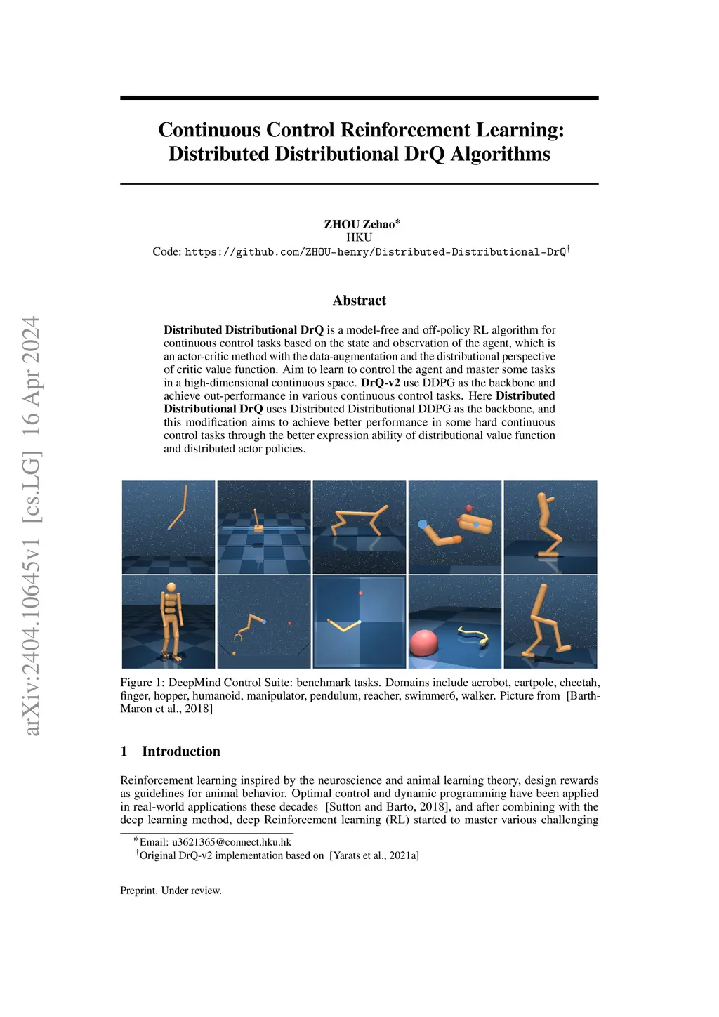 Distributed Distributional DrQ is a model-free and off-policy RL algorithm for continuous control tasks based on the state and observation of the agent, which is an actor-critic method with the data-augmentation and the distributional perspective of critic value function. Aim to learn to control the agent and master some tasks in a high-dimensional continuous space. DrQ-v2 uses DDPG as the backbone and achieves out-performance in various continuous control tasks. Here Distributed Distributional DrQ uses Distributed Distributional DDPG as the backbone, and this modification aims to achieve better performance in some hard continuous control tasks through the better expression ability of distributional value function and distributed actor policies.
